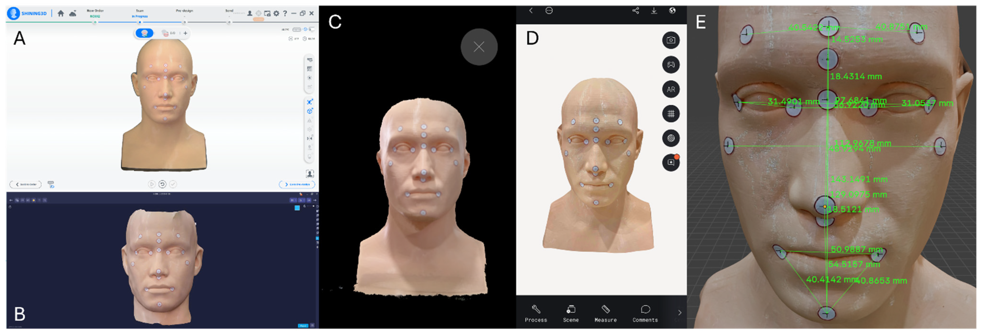 Therefore, the study aimed to evaluate and compare the trueness and precision of four extraoral 3D facial scanning systems, a handheld scanner (MetiSmile), a desktop scanner (RAYFace v2.0), and two smartphone-based applications (Heges and Polycam), using a standardized 3D-printed human head model. By analyzing both overall and region-specific performance, this study seeks to provide objective evidence for selecting suitable extraoral scanning technologies and to promote the rational integration of digital facial data into contemporary dental workflows.