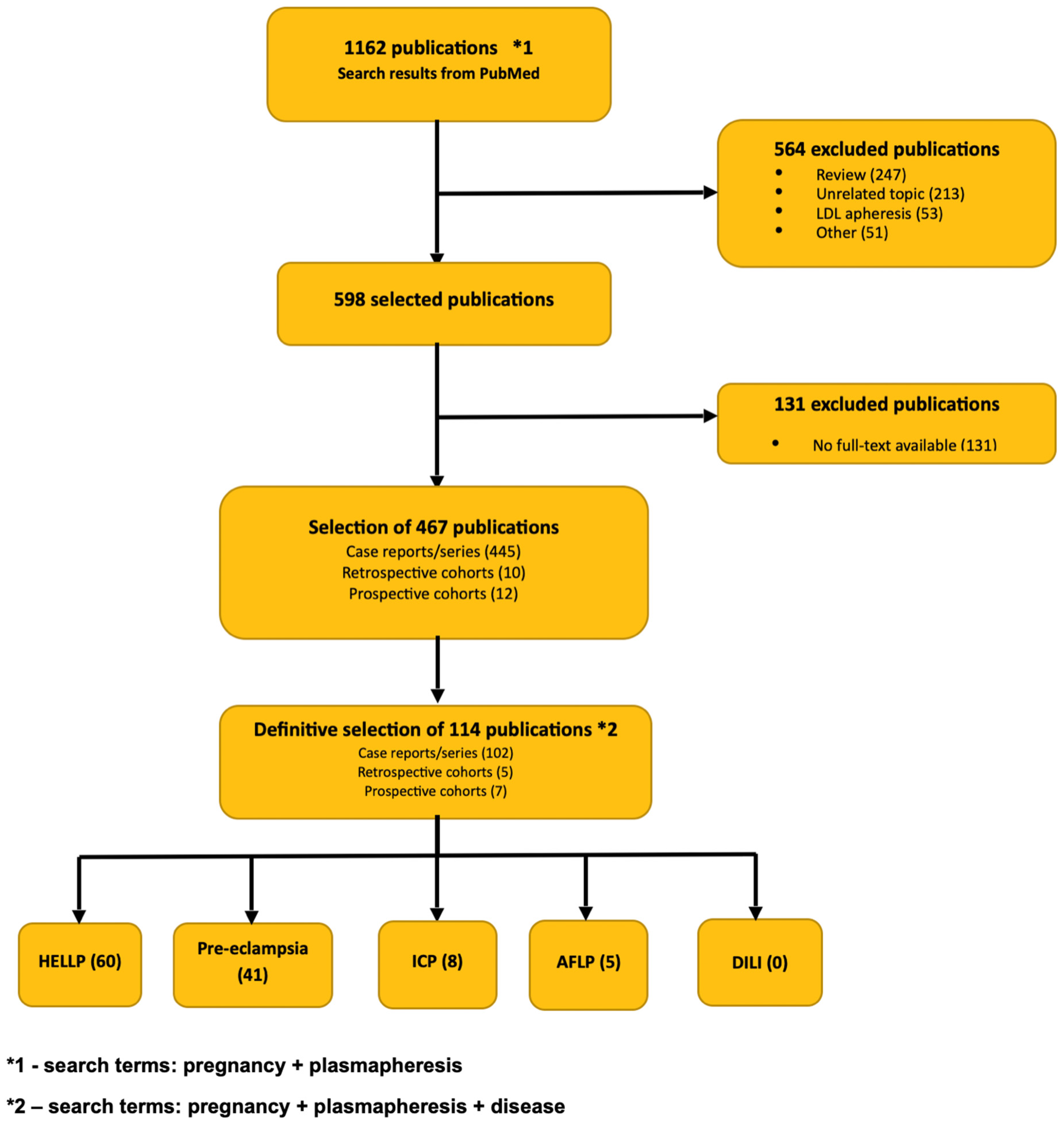To identify clinical indications for the use of TPE in pregnant women with liver injury, we conducted a systematic literature search using a strategy that included the terms “plasmapheresis,” “double-filtration plasmapheresis,” and “plasma exchange” combined with the word “pregnancy,” followed by “liver injury” or “acute fatty liver of pregnancy” or “HELLP” or “preeclampsia” or “intrahepatic cholestasis of pregnancy.” The search included studies published until November 2025 in PubMed. Case reports (series), as well as retrospective and prospective studies in English language, were included. Double-filtration plasmapheresis and TPE were considered for the qualification in the literature review, excluding other plasma separation methods. To evaluate plasmapheresis treatment in pregnancy, data extraction from each study was performed separately by two independent investigators. A systematic literature review of plasmapheresis in the treatment of liver injury in pregnancy identified 116 publications (Figure 1). Of these, 60 were in patients treated for HELLP, 41 for preeclampsia, 8 for ICP, 5 for AFLP, 1 patient for Herpes Simplex Virus infection, and 1 patient for AIH. We found no publications regarding a pregnant woman with DILI treated with plasmapheresis.