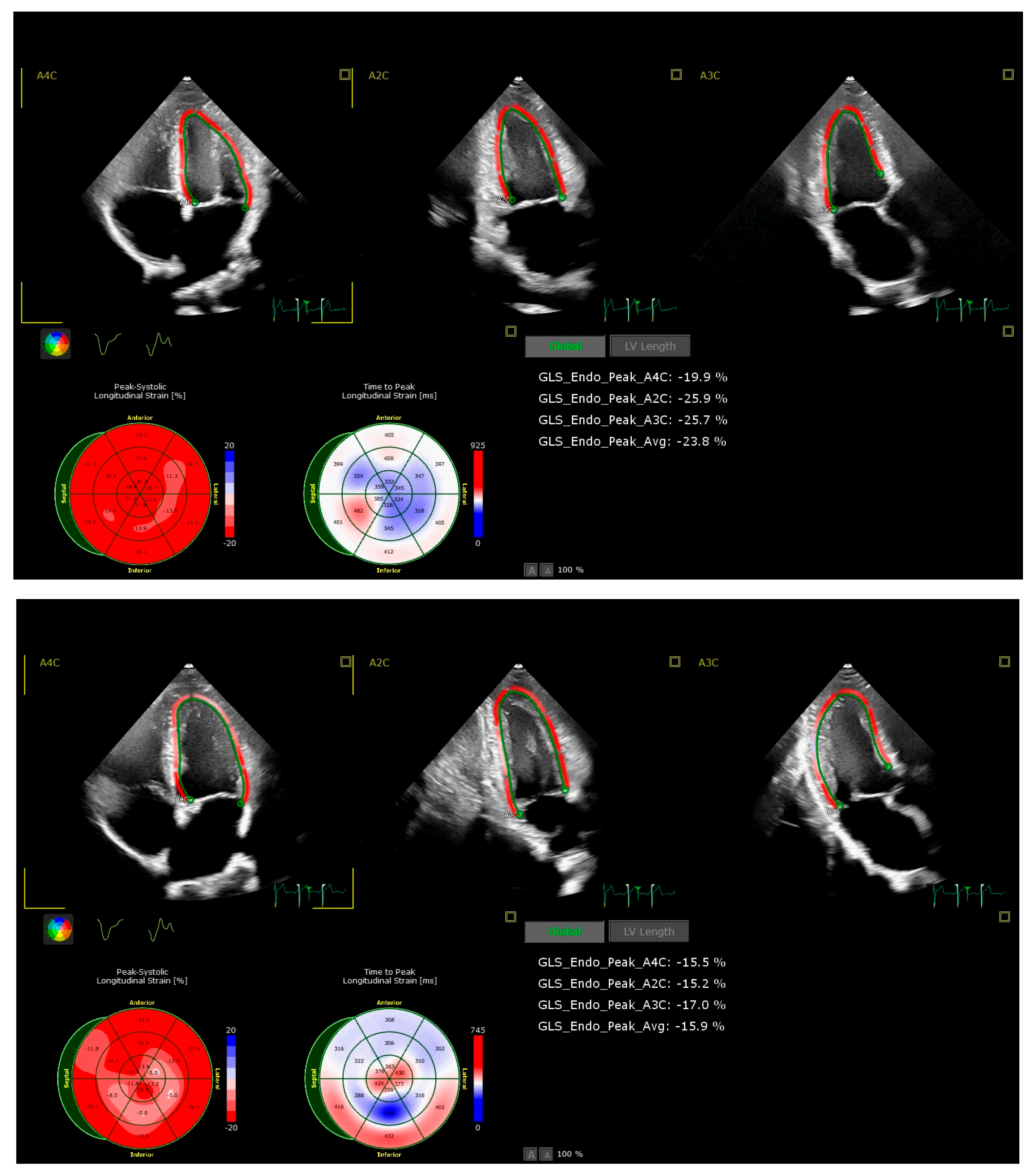 3.2. Echocardiography-Derived LV Dimensions and Systolic Function Parameters
