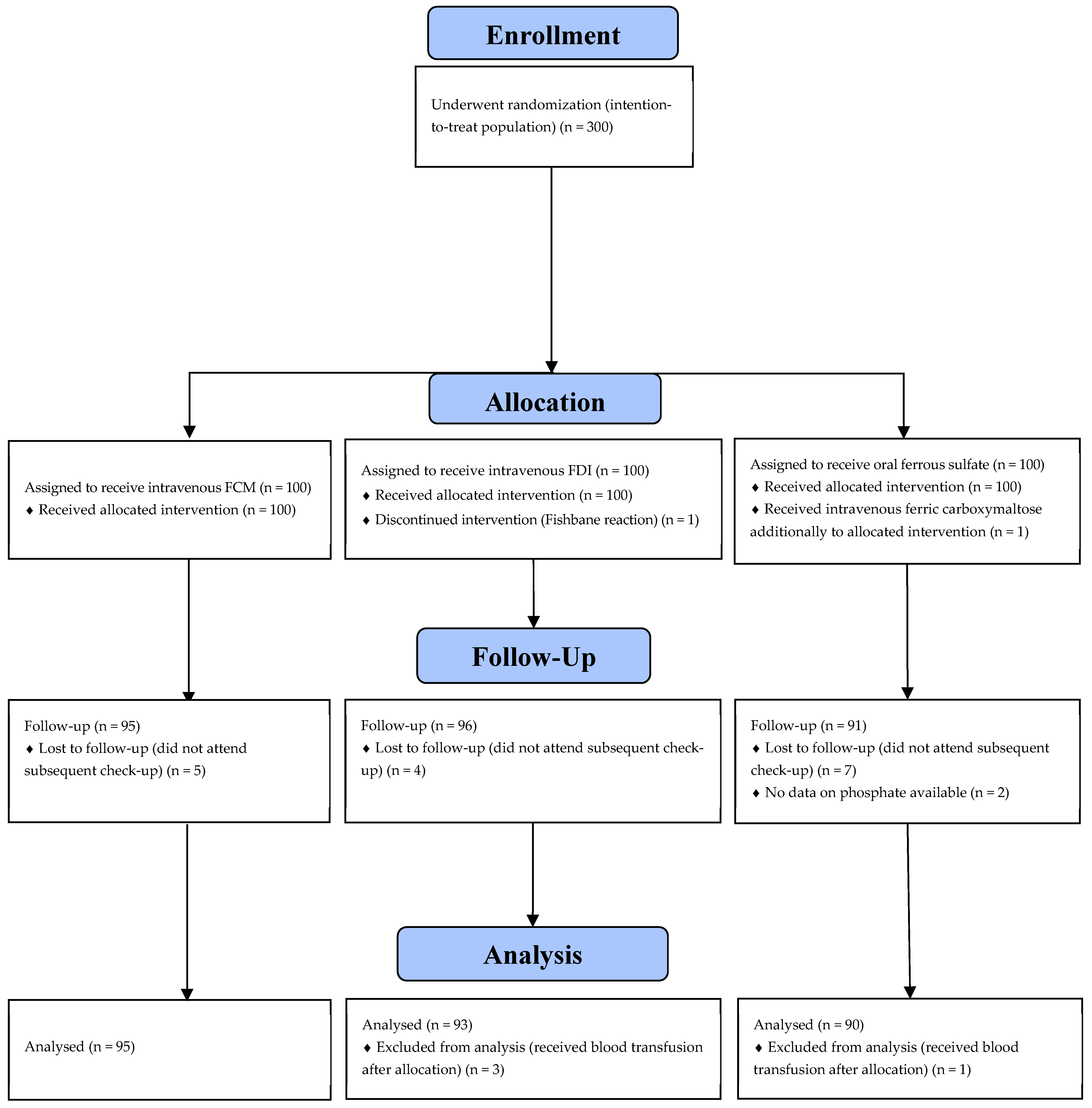| IV FCM (n = 95) | IV FDI (n = 93) | Oral Ferrous Sulfate (n = 90) | ||