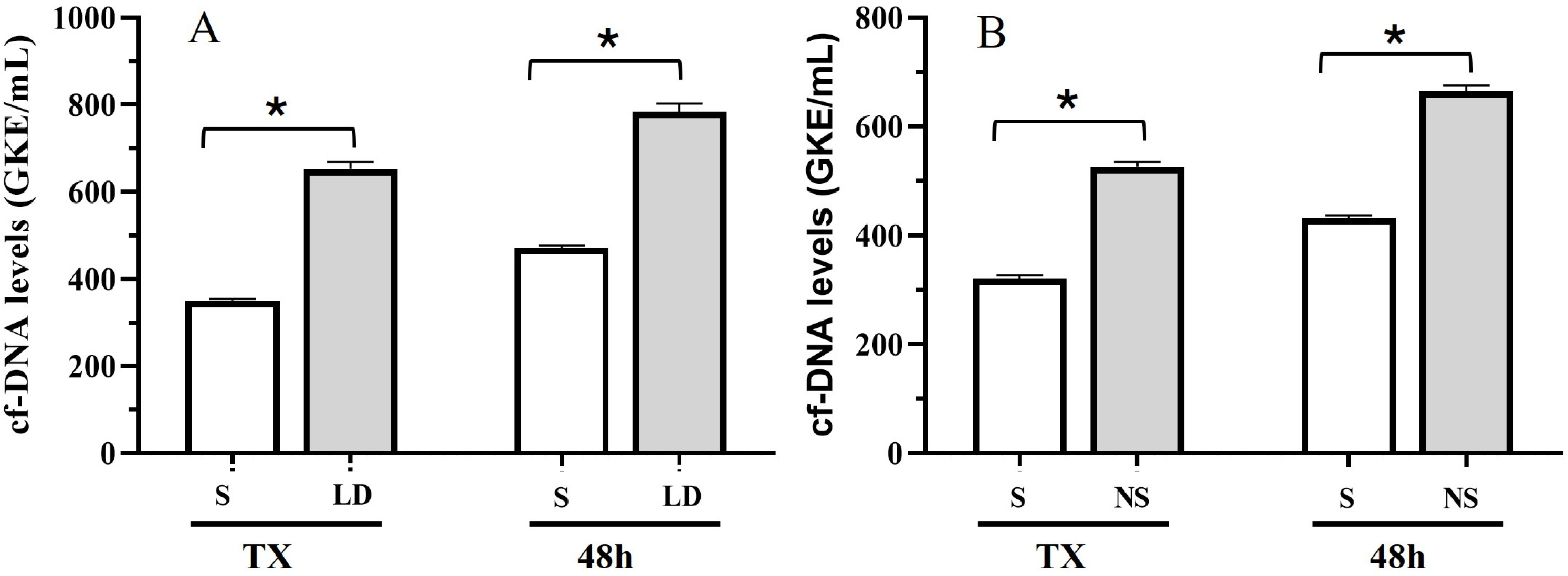 Figure 1. cfDNA levels at TX and during first 48 h for (A) stable patients (S) and patients with liver damage (LD); and (B) stable patients and individuals with any complication (NS), during the first month of follow-up. (t test (*) p < 0.05).