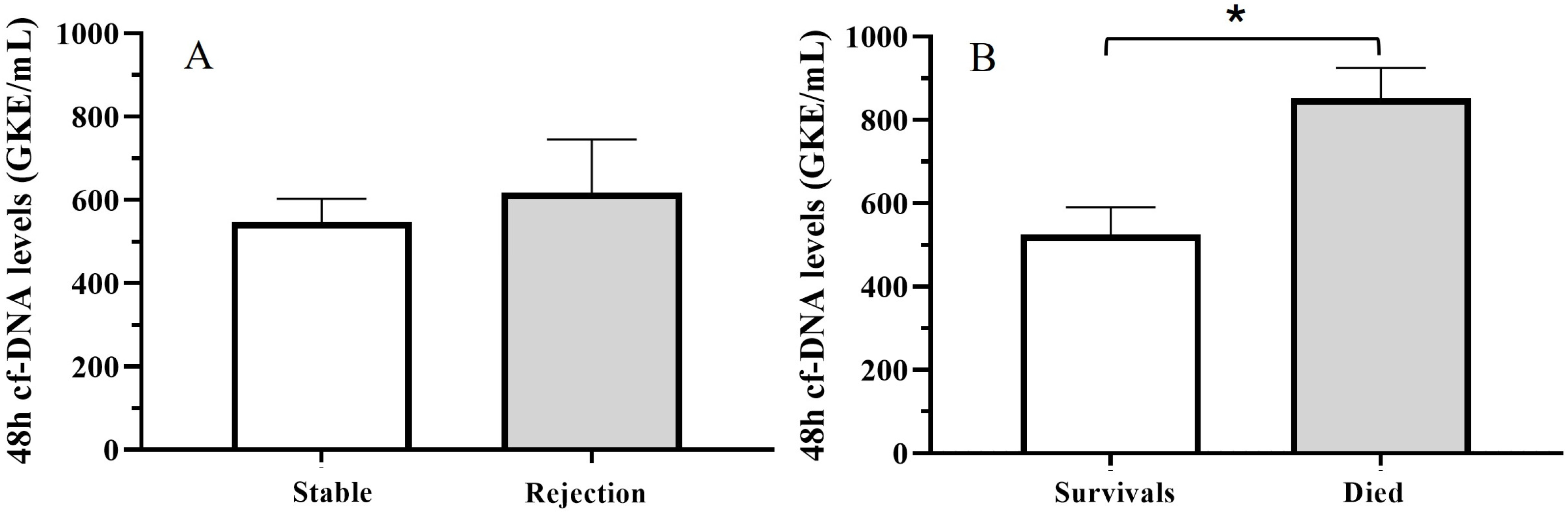 Figure 2. Mean 48 h cfDNA levels for (A) stable patients and patients who suffered rejection during the first month of follow-up; (B) survival patients and patients who died during the first three years after TX (t test (*) p < 0.05).