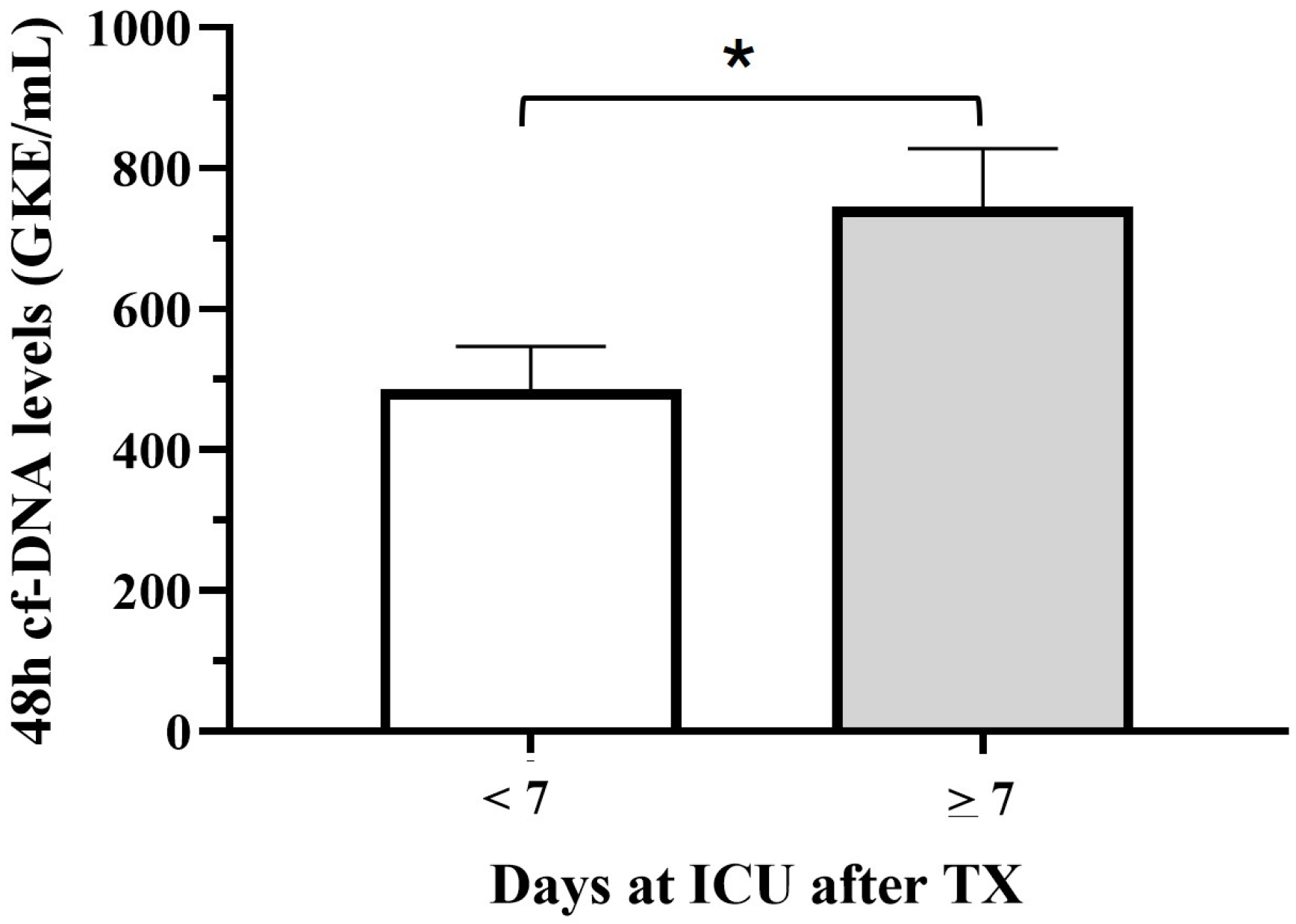 Figure 3. Comparison of mean 48 h cfDNA levels according to the period of stay at ICU (t test (*) p < 0.05).