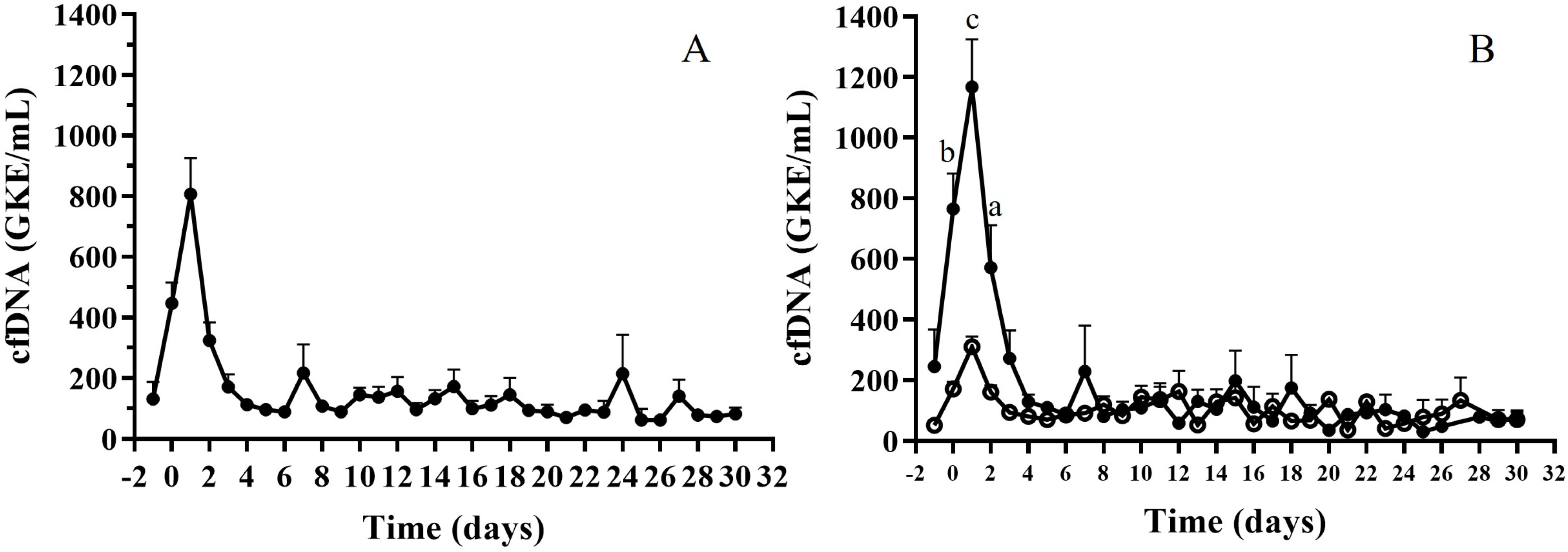 Figure 4. (A) cfDNA levels during the first month post TX; (B) cfDNA values after stratification of patients with high (HcfDNA; black circles) or low (LcfDNA; white circles) initial values. ANOVA test, (a) p < 0.005; (b) p < 0.0001; (c) p = 0.0002.