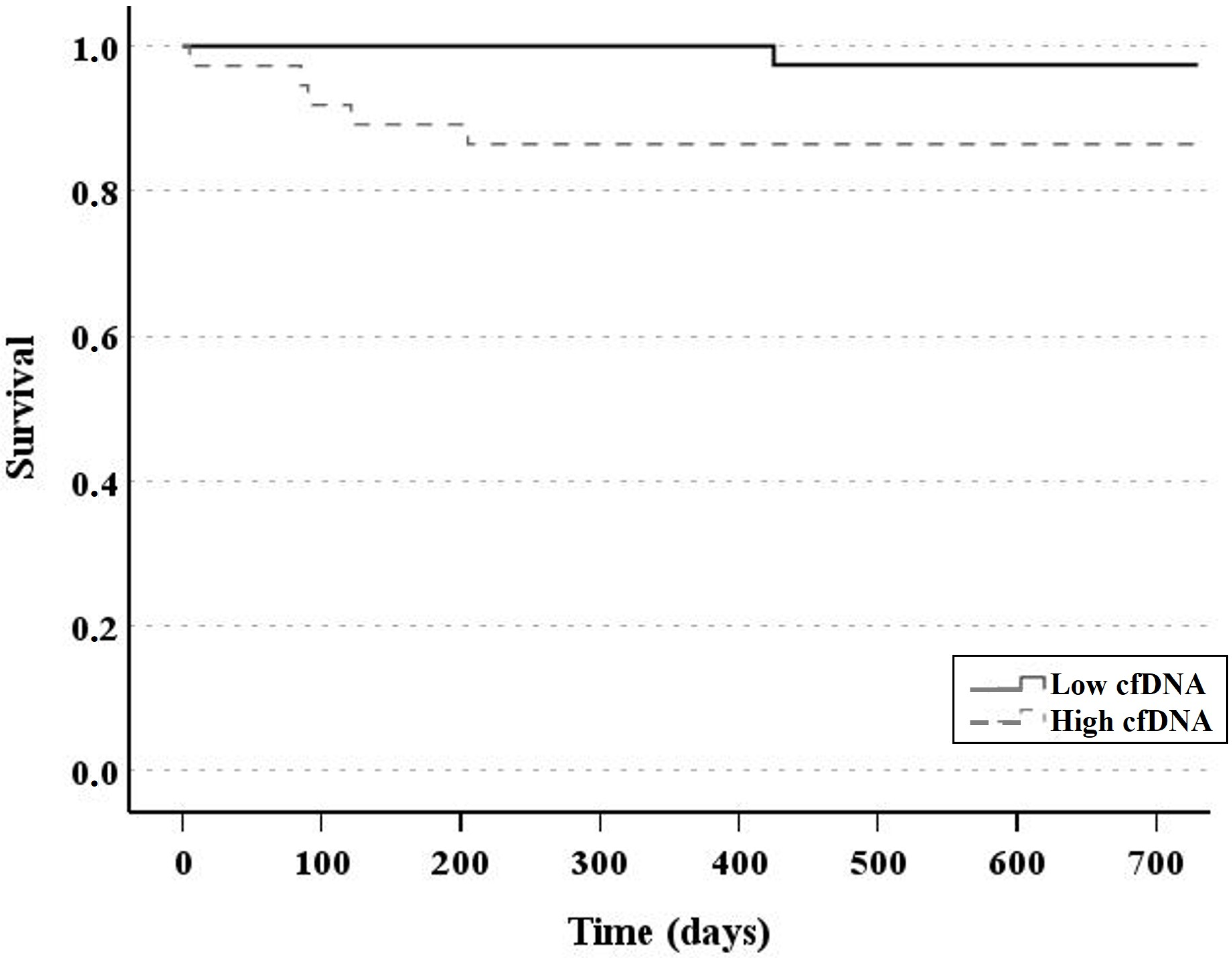 It has been hypothesized that high cfDNA may reflect cellular trauma and inflammation during surgery, being suggestive of a surgical stress marker [15]. Furthermore, elevated cfDNA values may reflect ischemia–reperfusion injury during liver transplantation. It has been well described that patients with elevated cfDNA levels, due to early unresolving allograft injury, are at risk of subsequent liver dysfunction. The high survival rate for LcfDNA patients observed in this study supports this information.