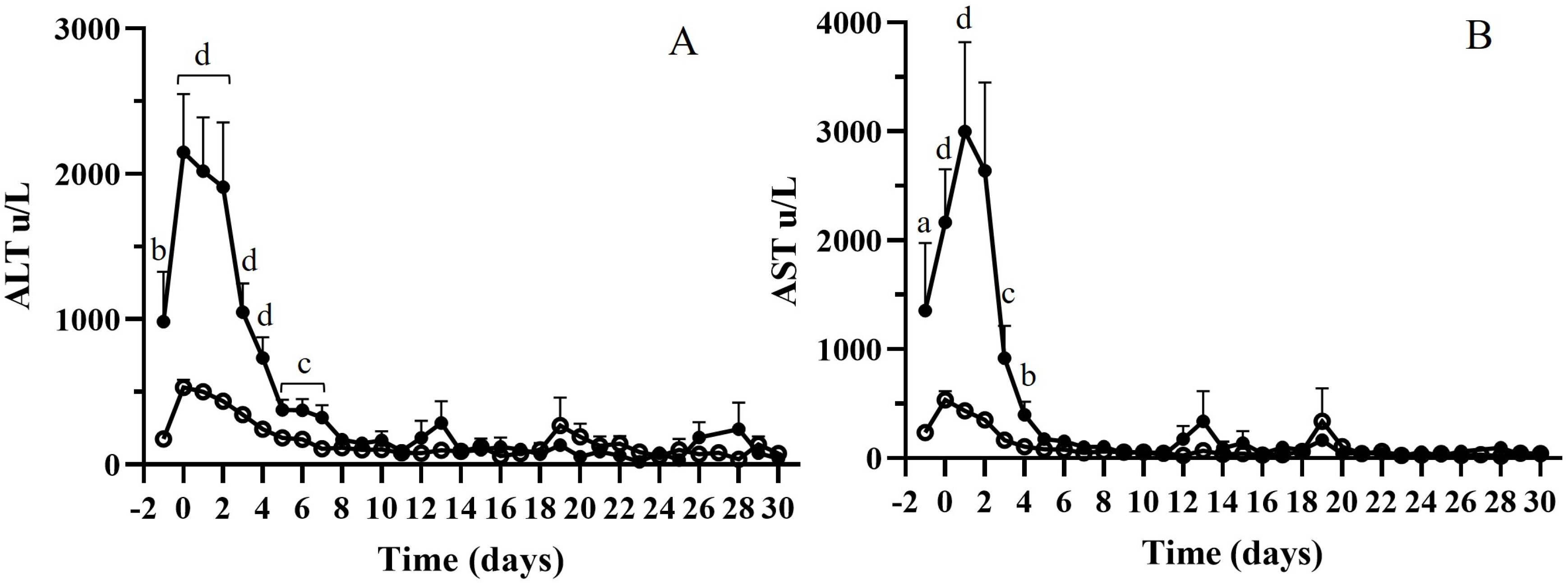 Figure 6. (A) alanine aminotransferase (ALT) and (B) aspartate aminotransferase (AST) levels during the first 30 days for the two groups of patients, HcfDNA (black circles) and LcfDNA (white circles). ANOVA test, (a) p < 0.05; (b) p < 0.005; (c) p < 0.001; (d) p = 0.0001.