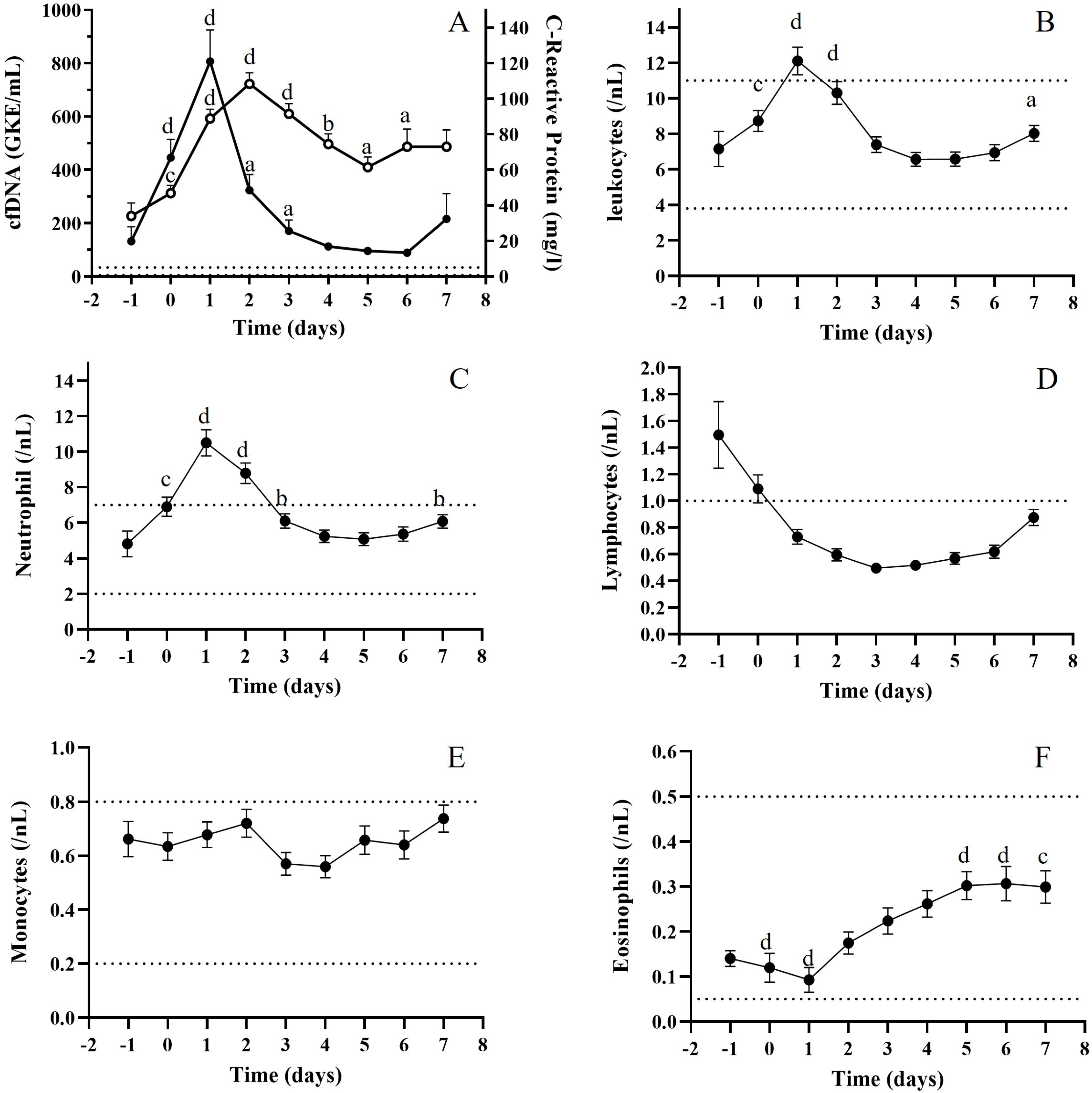 Figure 7. (A) C-reactive protein (CRP) levels and cfDNA levels during the first week after TX; (B) total leukocytes; (C) neutrophils; (D) lymphocytes; (E) monocytes and (F) eosinophils levels during the first week after TX. Wilcoxon test, (a) p < 0.01; (b) p < 0.005; (c) p < 0.001; (d) p < 0.0001.