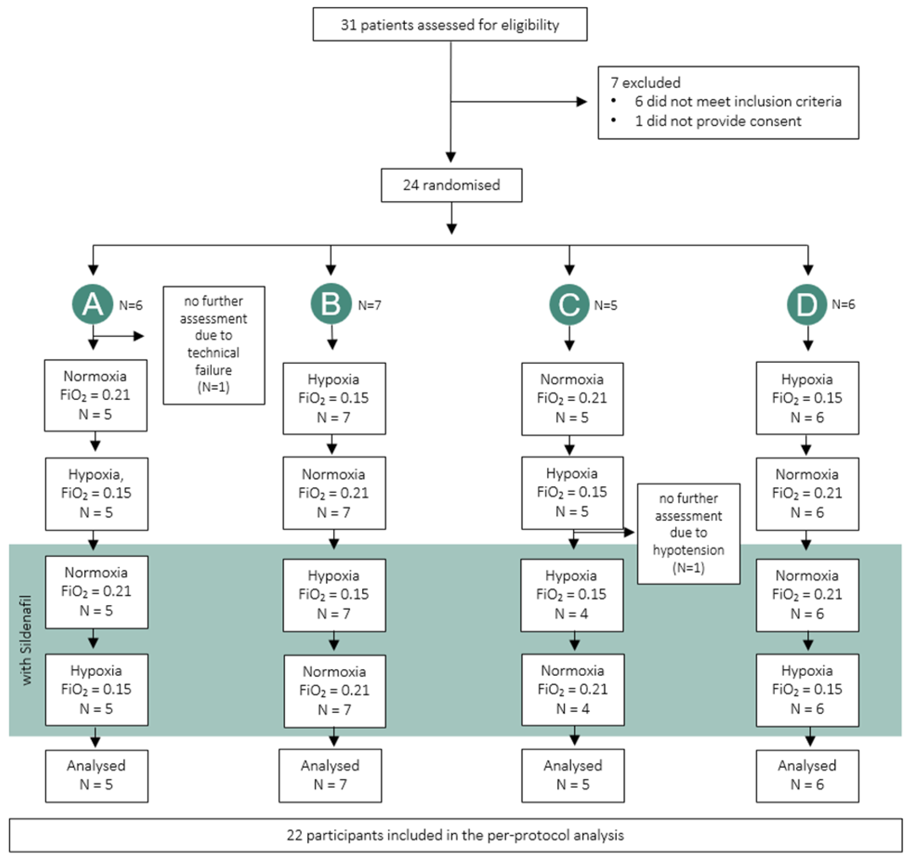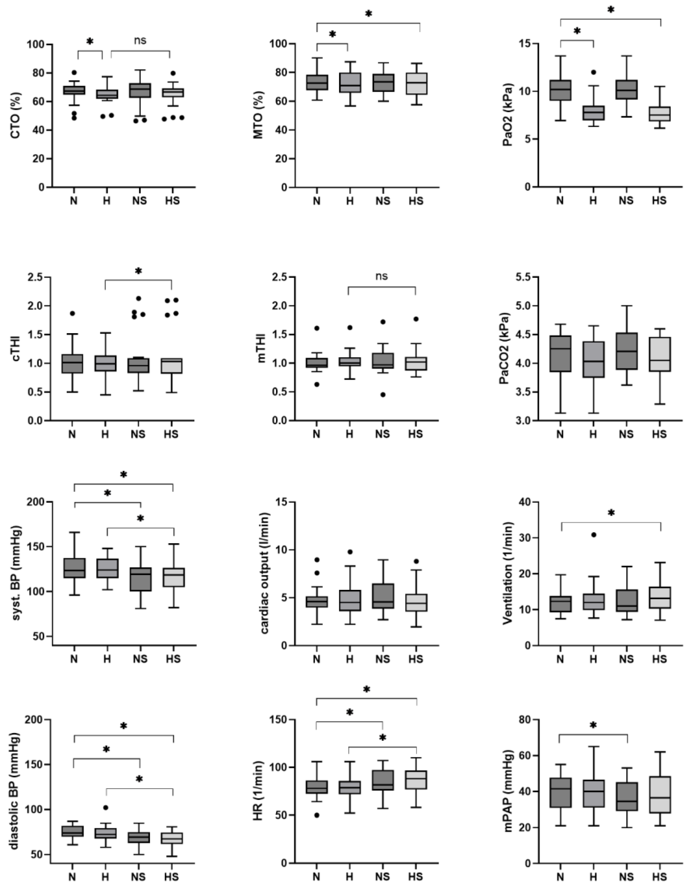 | Normoxia (N) | Hypoxia (H) | Normoxia After Sildenafil (NS) | Hypoxia After Sildenafil (HS) | Mean Difference ∆ H-N (95% CI) | Sildenafil Effect on Normoxia, Mean Difference ∆ NS-N (95% CI) | Mean Difference ∆ HS-NS (95% CI) | Sildenafil Effect on Hypoxia, Mean Difference ∆HS-H (95% CI) | |