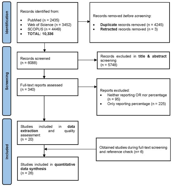 The initial search retrieved a total of 10,336 published papers. After removing 4245 duplicates and 3 retracted articles, 6088 studies were screened based on their titles and abstracts. Of these, 5748 papers were excluded, and 340 studies were selected for full-text screening, as illustrated in Figure 1.