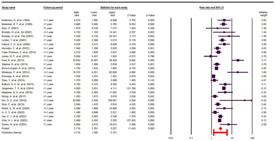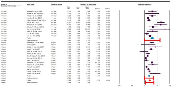 As shown in Figure 7, the risk of depression during the first year after stroke was almost twice as high as that in the period beyond the first year, although with a wider predictive interval. Specifically, the OR [95% CI] was 4.08 [2.70–6.15] with a predictive interval of [0.97–17.13] in the ≤1-year group, versus 2.28 [1.84–2.83] with a predictive interval of [1.03–5.05] in the >1-year group.