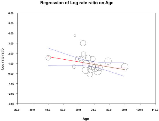 Meta-regression results (age). Circles represent the included primary studies, with their size proportional to its relative weight. The red line is the estimated regression line, while the blue lines indicate the 95% confidence interval for this regression estimate.