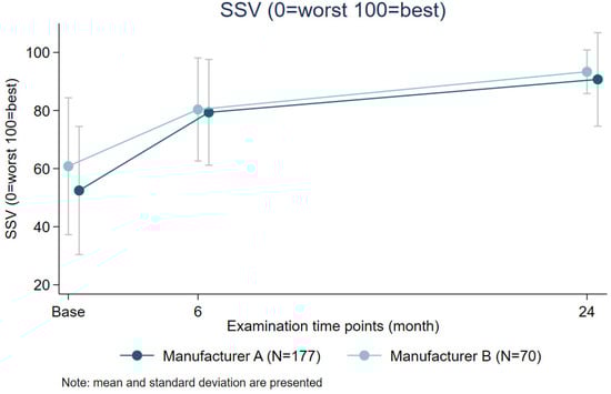 There were no significant differences noted in the Subjective Shoulder Value (SSV) or quality of life measures between the two manufacturers (7.02, p = 0.11) (see Figure 2 and Figure 3).