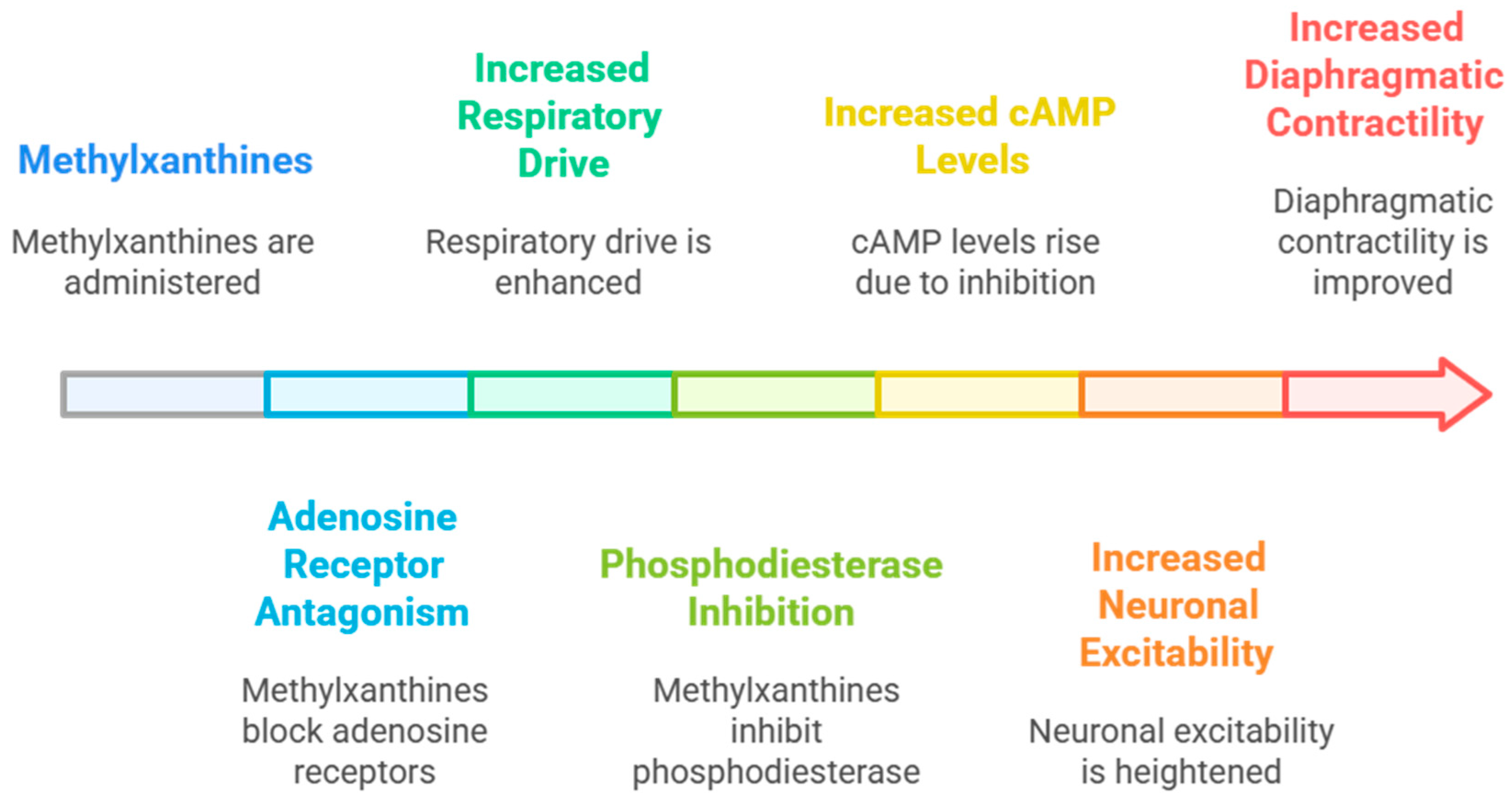 Methylxanthines (caffeine citrate, theophylline, and aminophylline) have emerged as the cornerstone of pharmacologic management. Acting as adenosine receptor antagonists, these agents stimulate central respiratory drive and improve diaphragmatic contractility (Figure 1) [6]. Caffeine citrate has become the preferred therapy owing to its longer half-life, wider therapeutic window, and superior safety profile compared to theophylline and aminophylline [7].