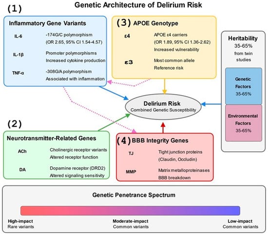 Genetic Architecture of Delirium Risk. This figure depicts the complex genetic architecture underlying delirium susceptibility in humans. The diagram presents four major genetic influence categories: (1) Inflammatory gene variants (IL-6, IL-1β, TNF-α) with specific polymorphisms and their associated odds ratios, including the IL-6 -174G/C polymorphism (OR 2.65, 95% CI 1.54–4.57), (2) Neurotransmitter-related genes affecting cholinergic and dopaminergic signaling, (3) APOE genotype, with ε4 carriers showing increased vulnerability (OR 1.89, 95% CI 1.36–2.62) compared to the common ε3 allele, and (4) Blood–brain barrier integrity genes including tight junction proteins and matrix metalloproteinases. The figure illustrates the relative contribution of genetic factors (35–65% based on twin studies) versus environmental factors to delirium risk in the vertical bar chart on the right. The bottom section shows the genetic penetrance spectrum from high-impact rare variants to common low-impact polymorphisms. Dotted arrows between gene categories indicate cross-pathway interactions, such as APOE’s influence on inflammatory responses and inflammatory genes’ effects on BBB integrity, highlighting the interconnected nature of genetic risk factors. References: [,,,,,,,,,].