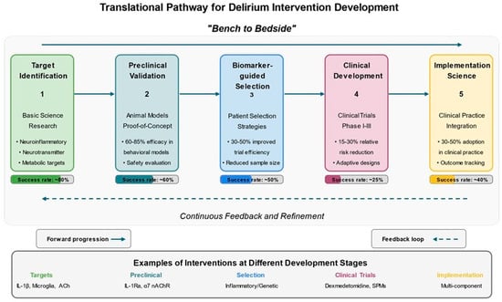 This review synthesizes the current landscape of translational research in postoperative delirium, examining how advances in neurobiology, neuroinflammation, genetics, and novel research methodologies collectively enhance our understanding of delirium pathophysiology and inform innovative therapeutic approaches [,]. Both the acute presentation of delirium and its potential progression to long-term cognitive impairment will be addressed throughout this review, paying particular attention to the mechanisms that possibly drive the transition from transient to persistent neurocognitive dysfunction. Historical approaches to delirium management have been largely reactive and symptomatic, primarily focused on introducing environmental modifications, administering antipsychotic medications, and providing supportive care []. These interventions often fail to address the underlying pathophysiology and have shown limited efficacy in preventing or treating postoperative delirium []. Contemporary research offers valuable insights into the biological mechanisms of delirium that can serve as targets for prevention, early detection, and mechanism-based interventions []. Understanding these mechanisms is essential for developing effective clinical strategies that move beyond symptom management to address the underlying causes of this complex syndrome.