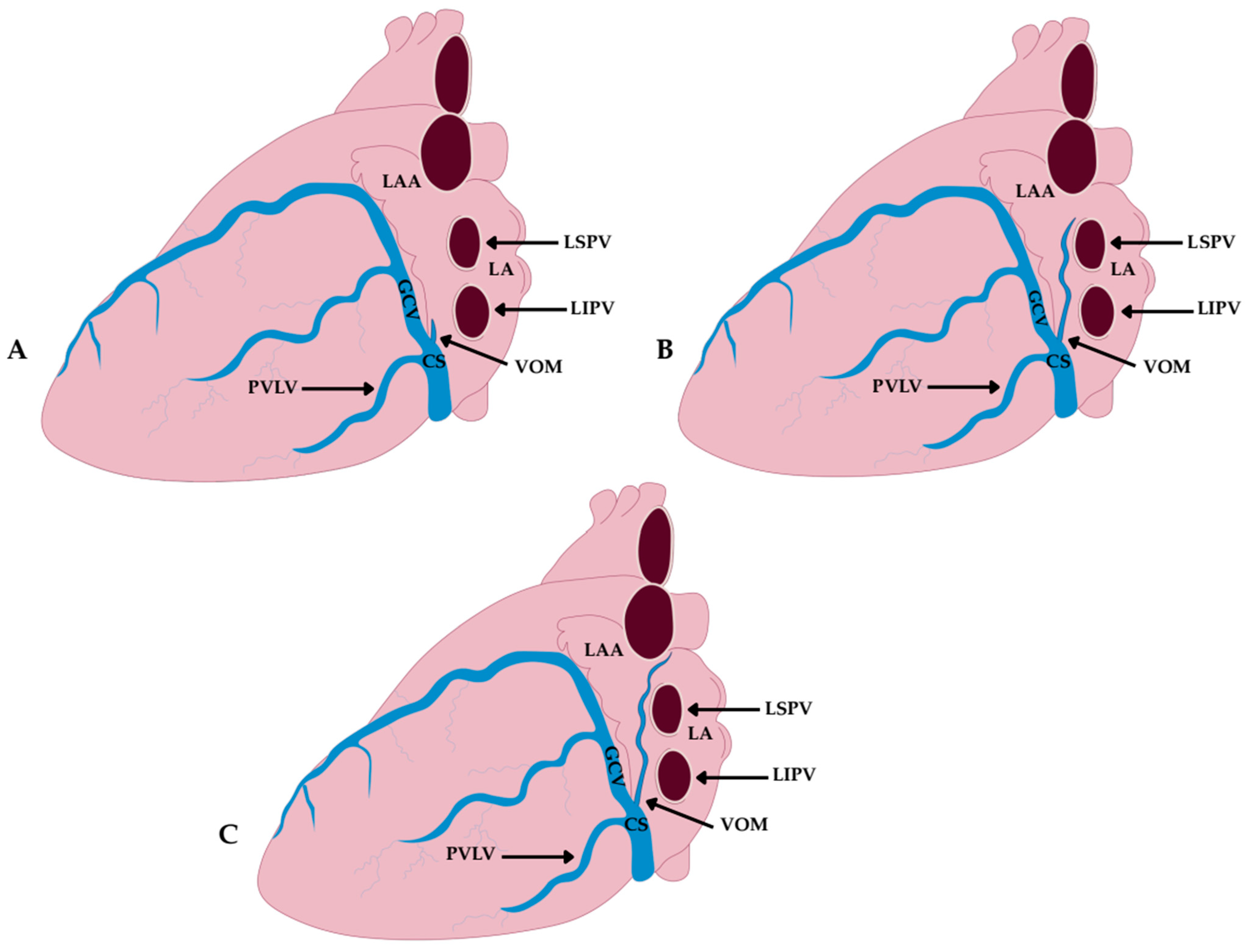 - Zhang, H.-D.; Ding, L.; Yu, F.-Y.; Mi, L.-J.; Zhang, K.; Weng, S.-X.; Jiang, Z.-H.; Tang, M. Angiographic assessment of vein of Marshall in atrial fibrillation: Implications for identification and cannulation. Heliyon 2023, 9, e21266. [Google Scholar] [CrossRef] [PubMed]