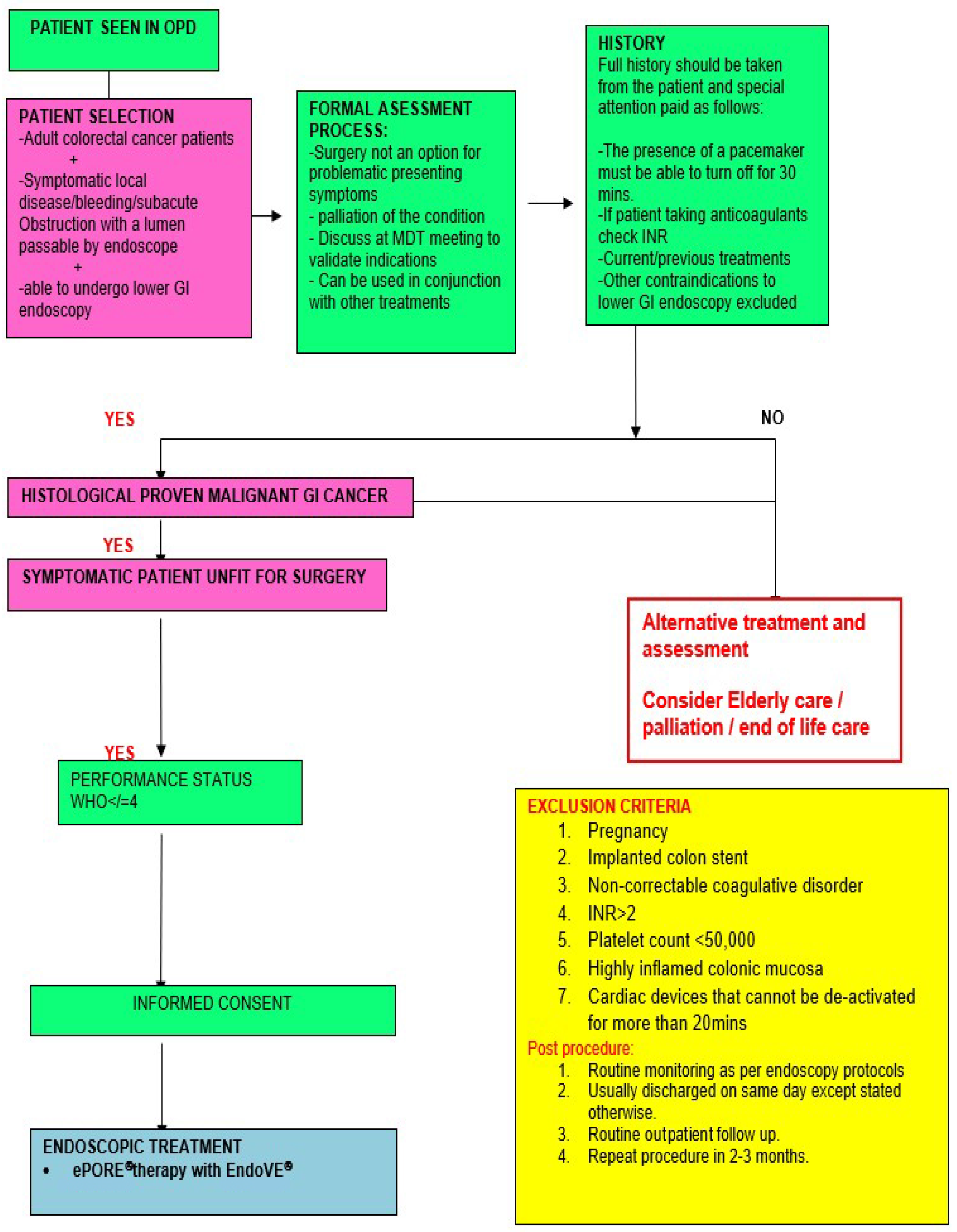 Patients considered for EE should be identified through a formal MDT discussion involving colorectal surgeons, medical oncologists, pathologists, radiologists, therapeutic endoscopists, onco-geriatricians (where applicable), colorectal nurse specialists (CNS), patient advocates, and palliative care specialists. This collaborative approach ensures a thorough evaluation of the disease extent, patient fitness, and overall care goals. Before referral, alternative standard treatment modalities—including surgery, radiotherapy, systemic chemotherapy, and brachytherapy—should have been either exhausted, deemed unsuitable, or declined by the patient.