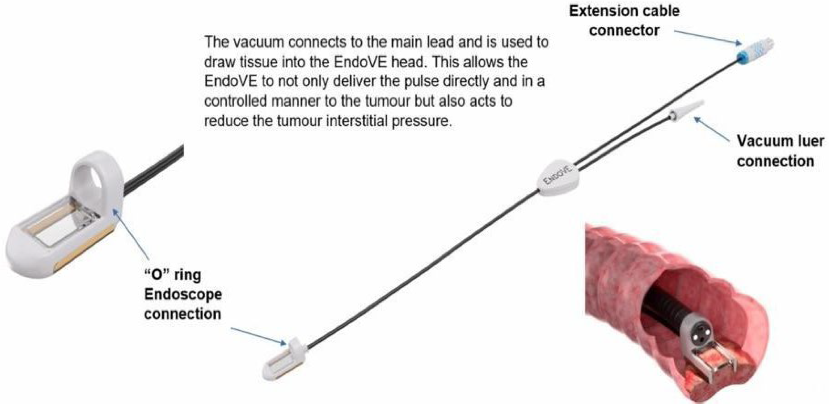 The probe is activated using a high-suction vacuum to maximise contact with the tumour. Pulsed electric fields (with 1 cm penetration depth and covering a 2 cm
