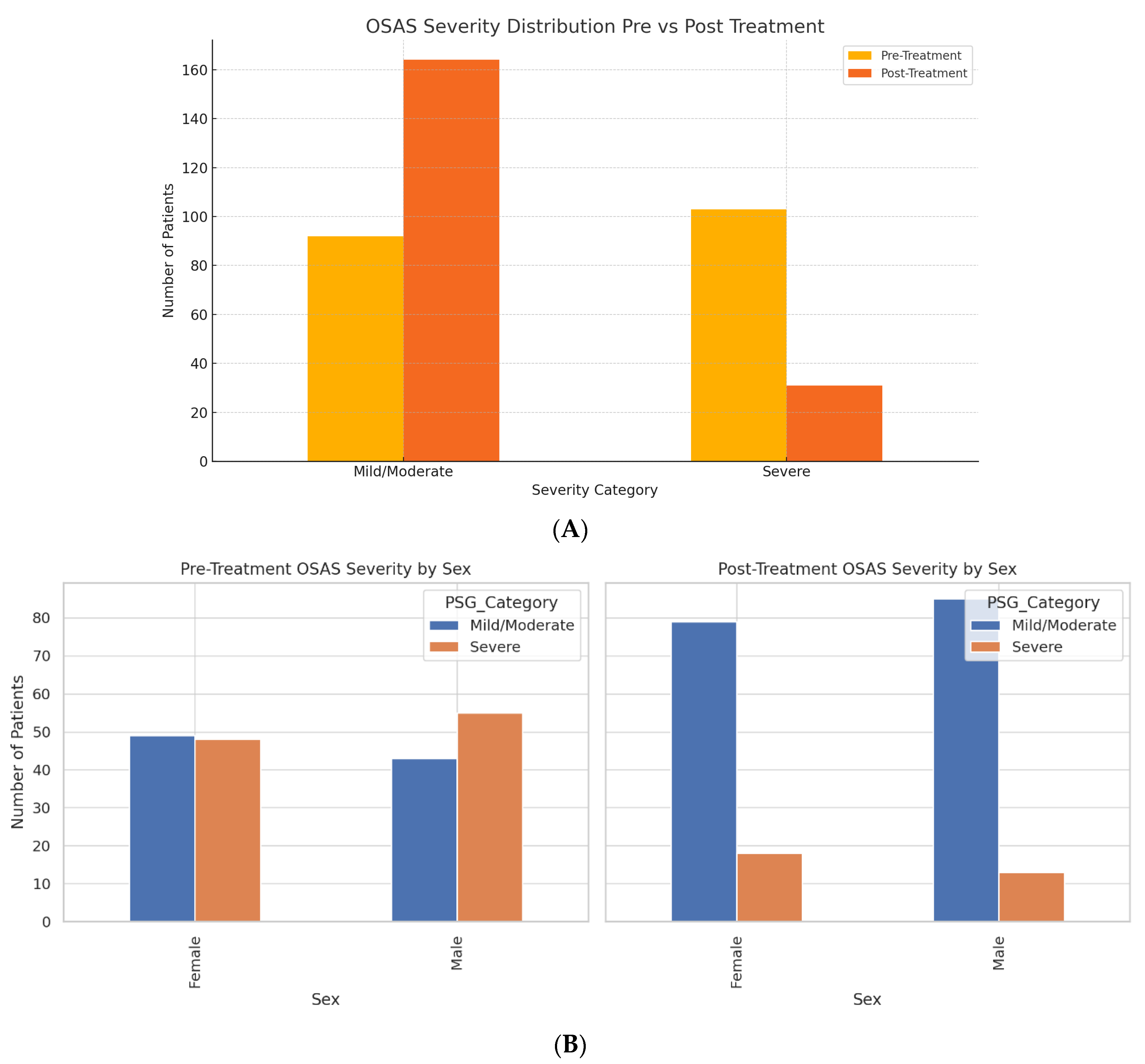 Figure 1B). Mild/moderate OSAS cases among females increased from 49 to 79, and severe cases decreased from 48 to 18. Similarly, males shifted from 43 to 85 in the mild/moderate category and from 55 to 13 in the severe group.