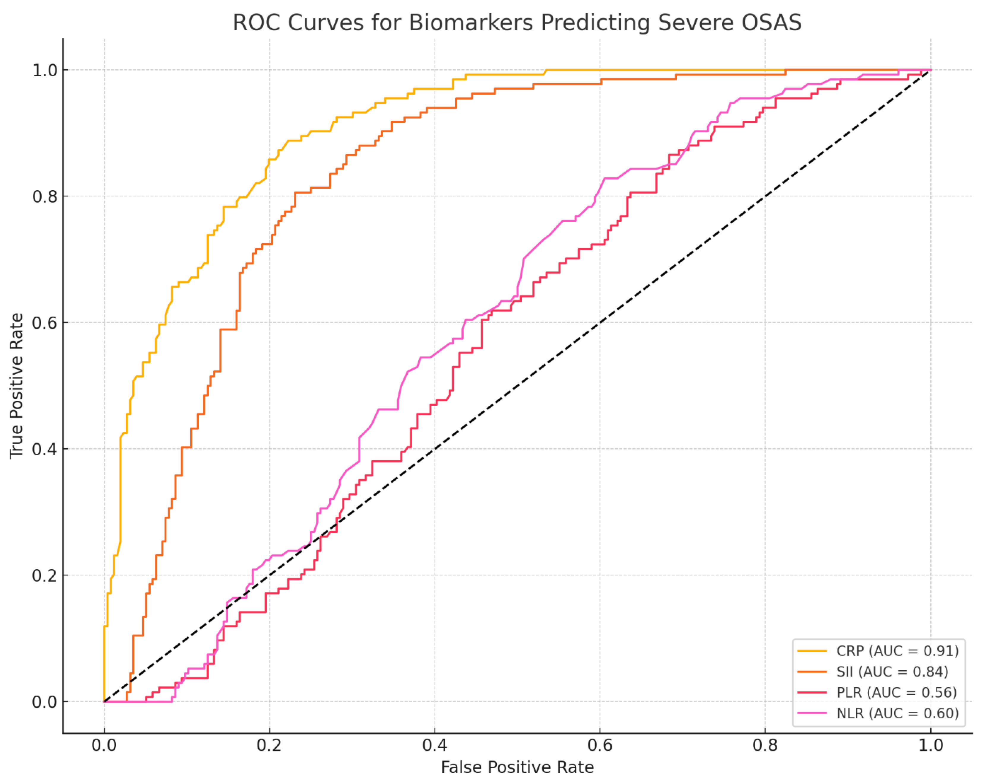 ROC Curve Analysis. CRP showed good discrimination for severe OSAS (AUC = 0.91; 95% CI 0.86–0.95), with sensitivity 0.83 (95% CI 0.74–0.90) and specificity 0.82 (95% CI 0.72–0.89). SII demonstrated moderate discrimination (AUC = 0.84; 95% CI 0.78–0.90) with corresponding cut-offs based on Youden’s J (