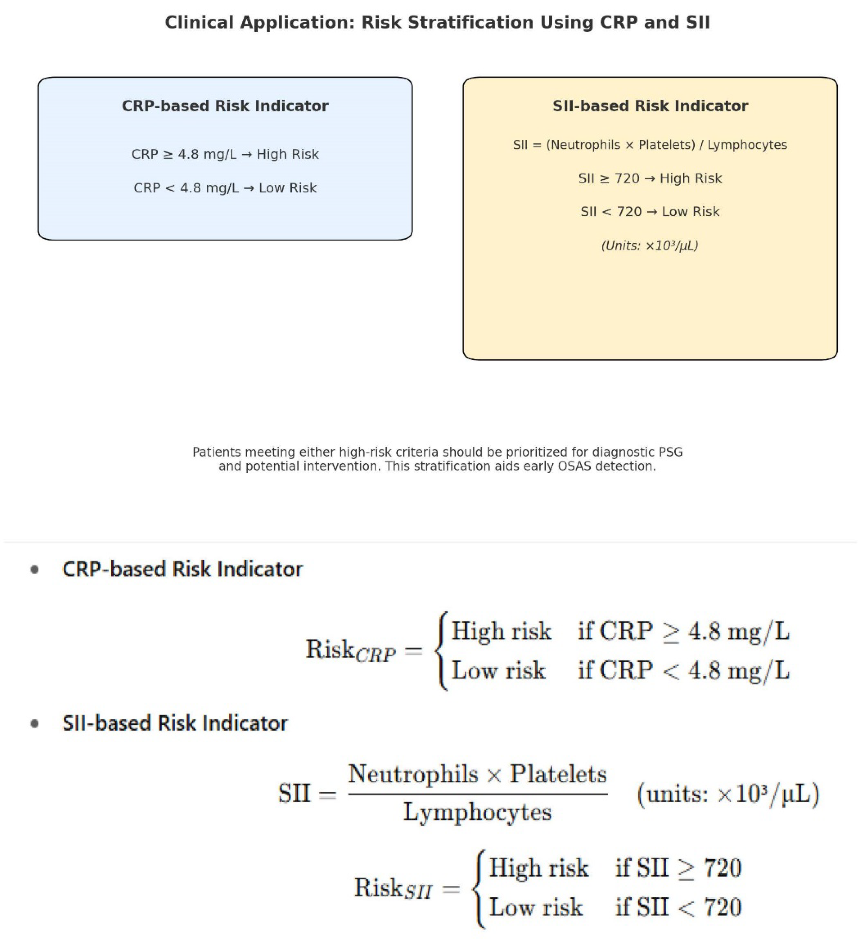 15]. Furthermore, derived hematological indices such as the neutrophil-to-lymphocyte ratio (NLR), platelet-to-lymphocyte ratio (PLR), and the systemic immune-inflammation index (SII) have emerged as accessible, cost-effective markers that capture immune imbalance and hypercoagulability—two key features in the OSAS inflammatory phenotype [