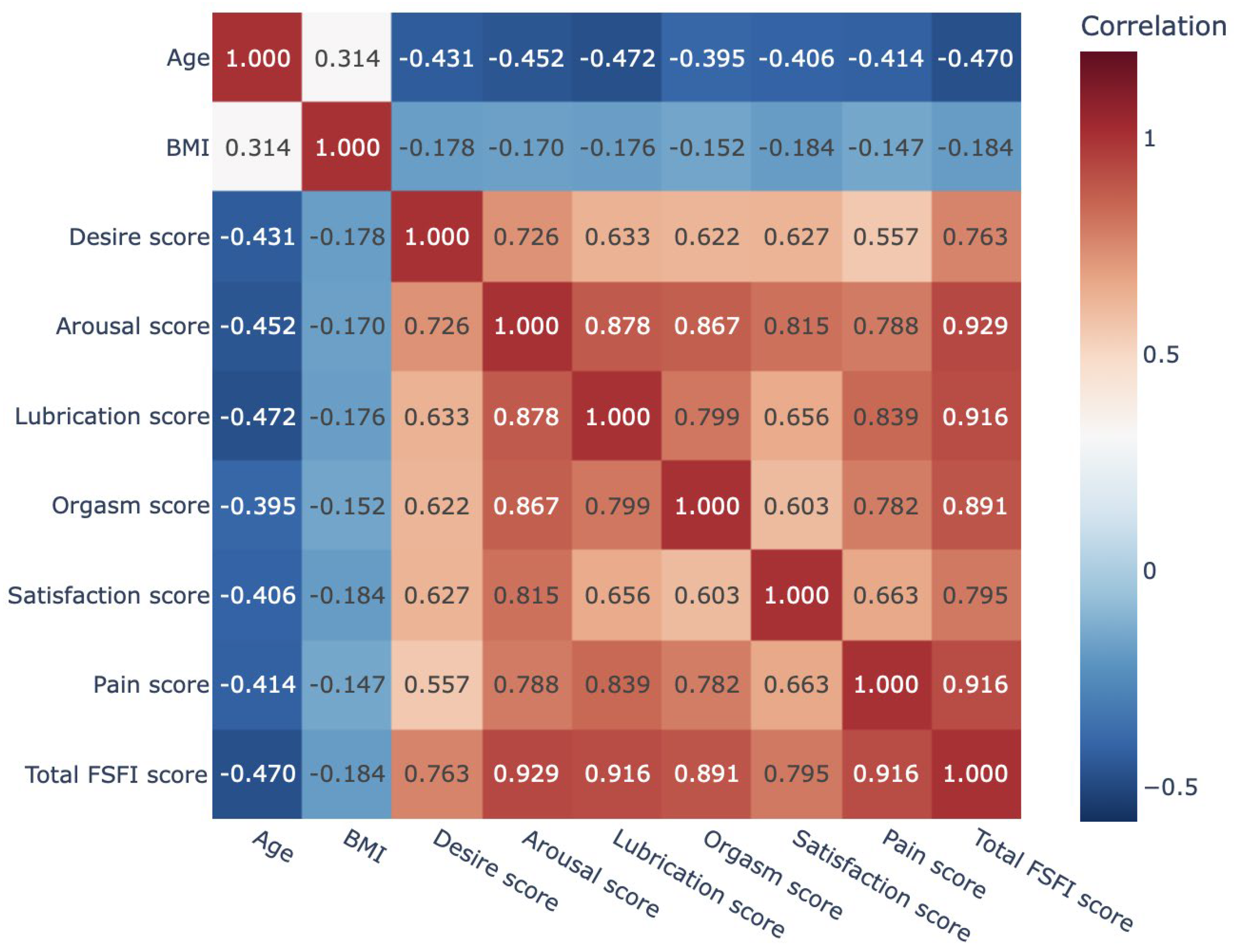 3.2. Analysis of Female Sexual Function Index (FSFI) Domain Scores and Their Associations with Age and Body Mass Index
