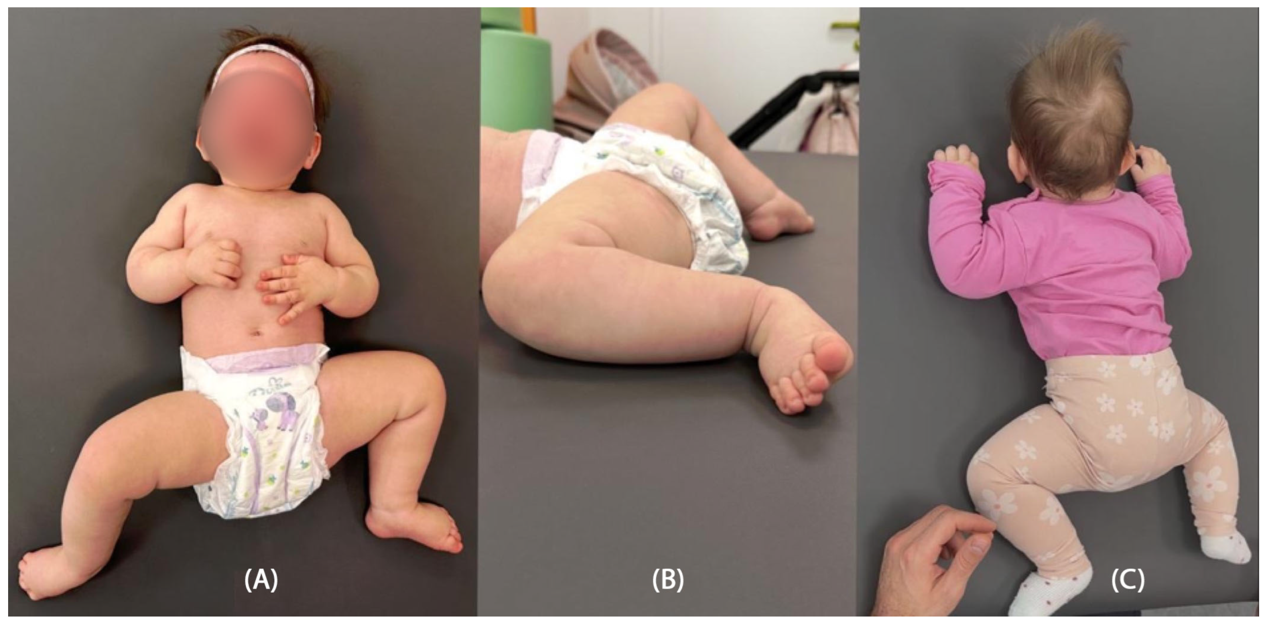 At four months of age, the parents expressed concerns regarding their daughter’s psychomotor development, noting an inability to support herself in the prone position, limited eye contact, and the absence of voluntary grasping. As a result, early rehabilitation was initiated in a specialized center. Due to unsatisfactory progress during the rehabilitation process and the presence of dysmorphic features, the physiotherapist recommended further extended diagnostics. In the 7th month of life audiological evaluation revealed bilateral sensorineural hearing loss of 60 dBnHL, and hearing aids were fitted. At approximately 9 months of age, cranial ultrasound was normal, while neurological examination revealed decreased central muscle tone, delayed psychomotor development, and positional asymmetry with asymmetric cutaneous reflexes, including asymmetrical superficial reflex responses such as the plantar and palmar grasp reflexes, which were more active on the left side. At 9 months, physical examination revealed a eutrophic infant (10 kg, OFC 43 cm) with craniofacial dysmorphism, including bitemporal narrowing, wide mouth, and epicanthal folds. In this time EEG performed for suspected seizures showed no epileptiform activity. At 11 months and two weeks of age, in the quantitative and qualitative assessment consistent with the Vojta diagnostic method, the patient showed no improvement in spontaneous motor activity compared with the previous evaluation. In the reflex assessment, a persistently strong Moro response was observed, along with continued activity of the orofacial rooting and the Babkin reflex. All seven Vojta postural reactions were evaluated as abnormal. Deep tendon reflexes were assessed by the neurologist as symmetric, and no pathological plantar responses from the Babinski group were present. At the age of 12 months ophthalmologic and optometric assessment demonstrated intermittent divergent strabismus of the right eye, hyperactivity of the inferior oblique muscle, sluggish pursuit, and hypermetropia with astigmatism bilaterally; anterior segment and fundus examinations were unremarkable.