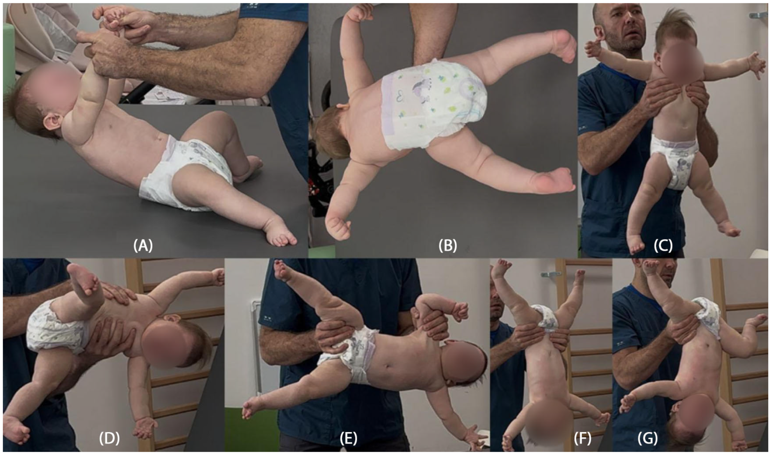 Figure 2B–G). Only in the first suspension (traction) test does the patient show a partial, age-appropriate flexion response of the head and cervicothoracic spine, opposing gravity by activating the ventral neck and thoracic muscles; in the lower limbs, excessive abduction, hip and knee flexion, and foot pronation remain constantly visible (