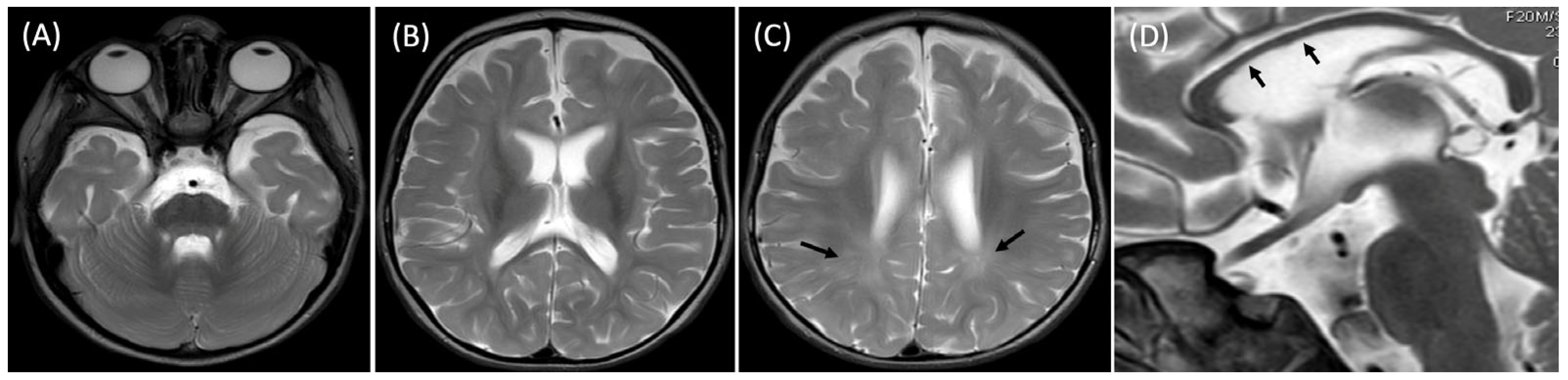 At 20 months, the brain MRI revealed mild generalized atrophy of the cortex and the white matter, bilateral T2 hyperintensities of the posterior portions of the white matter indicating its delayed myelination and slightly hypoplastic corpus callosum (