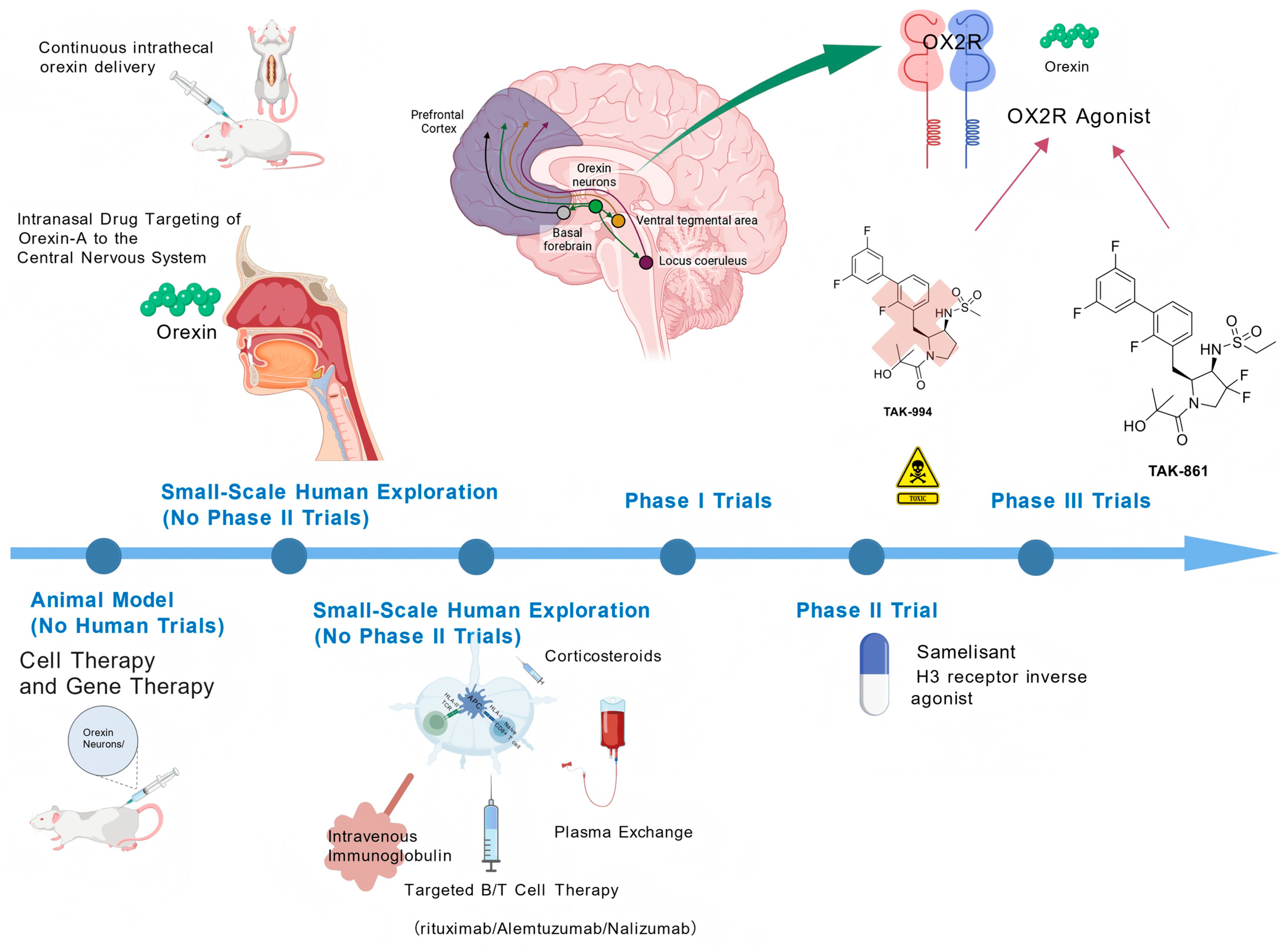 | Targeted B/T Cell Therapy | Rituximab (anti-CD20, B-cell depletion) | Deplete mature B cells and suppress humoral immunity | 1 case of Post-Pandemrix NT1 with psychiatric symptoms: Symptoms improved in the short term (2 months), subsequent infusions were ineffective [125]; 1 case of a 28-year-old male: 5 treatments of 1000mg/6 months, subjective improvement in EDS but no change in syncope, CSF orexin-A progressively decreased [126]. | Irreversible neuronal loss, no sustained benefit after B-cell depletion, potential risk of infection |