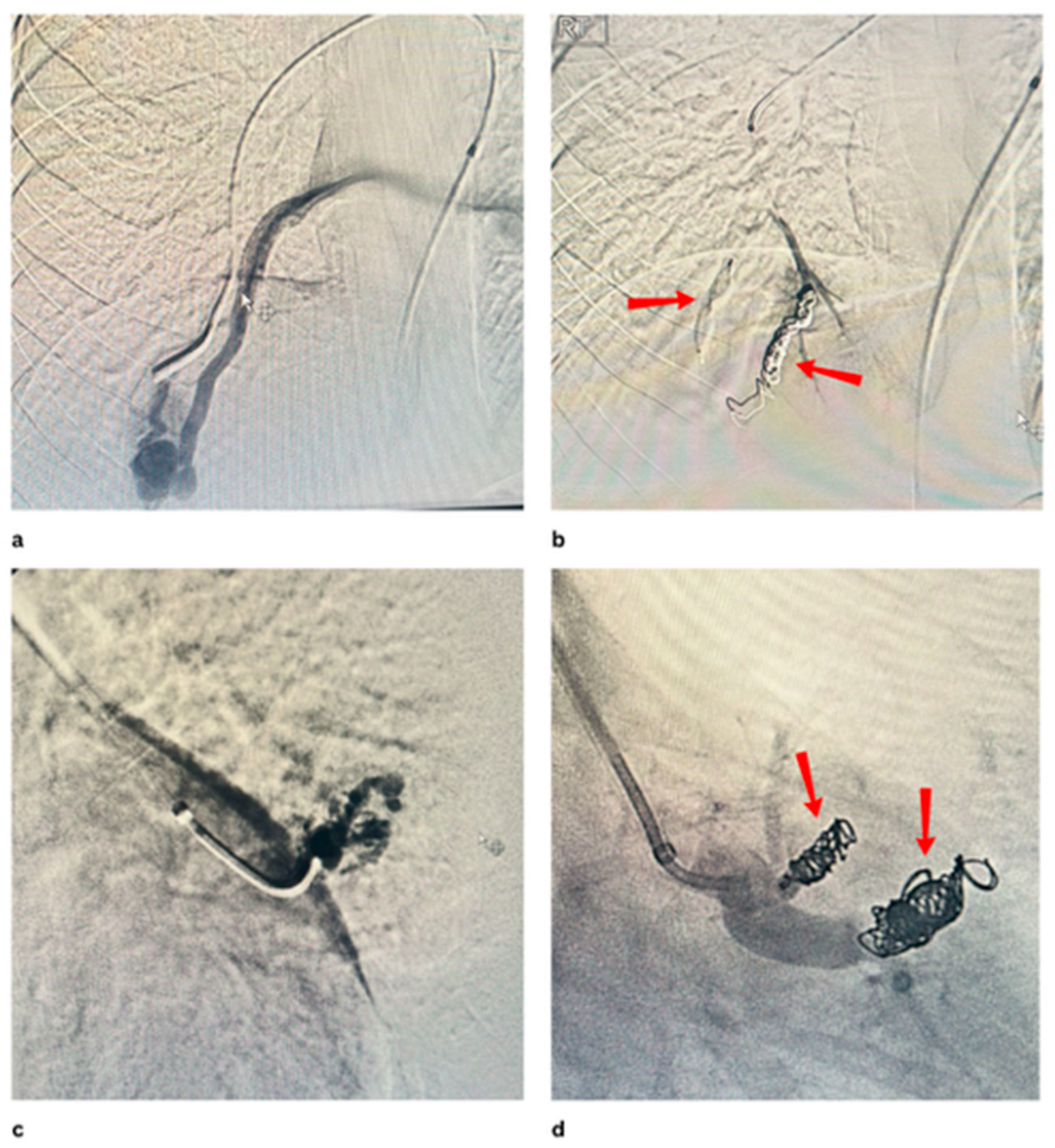 - Cil, B.E.; Erdogan, C.; Akmangit, I.; Cekirge, S.; Balkanci, F. Use of the TriSpan Coil to Facilitate the Transcatheter Occlusion of Pulmonary Arteriovenous Malformation. Cardiovasc. Interv. Radiol. 2004, 27, 655–658. [Google Scholar] [CrossRef] [PubMed]