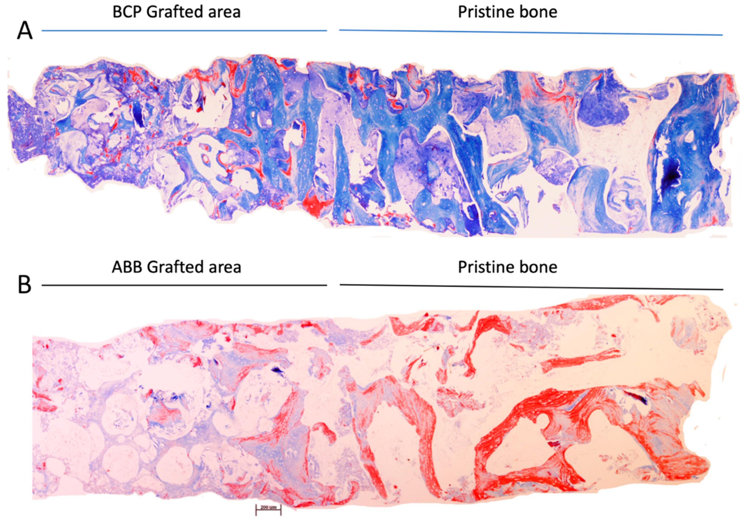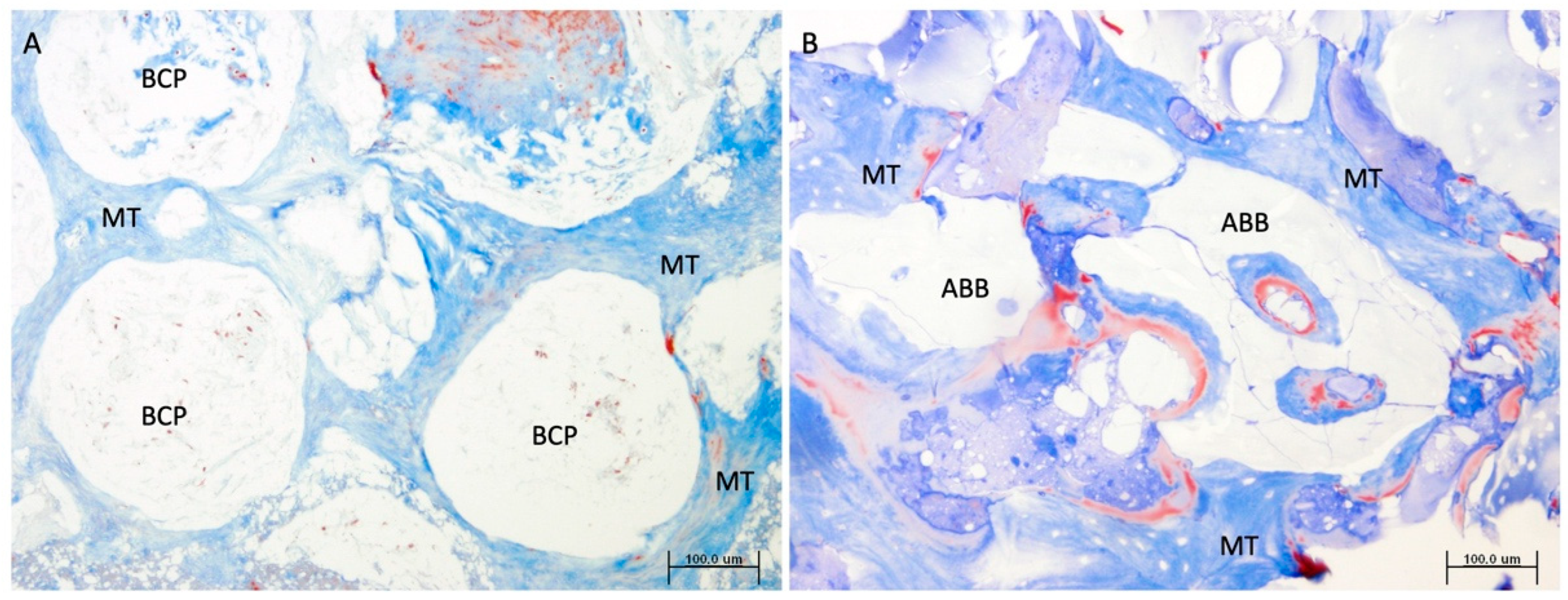 - Regarding the presence of remnant biomaterial, BCP disappears earlier in the newly formed bone, perhaps due to a different resorption mechanism than ABB or a different response to the osteoconduction mechanism. From the histological observation of these samples, it can be clearly seen how the pattern of formation of new mineral structure appears different between the two types of biomaterial particles. While the anorganic bovine bone particles seem to establish an intimate contact with the new bone mineral structure, the beta tricalcium-phosphate (beta-TCP) granules seem to allow bone formation in a more eccentric way, maintaining the porosity between the granules in a more intact way, which could facilitate the earlier physico-chemical action of the fluids and proteins of the tissue microenvironment. On the other hand, comparatively, anorganic bovine bone is much more crystalline in nature and somewhat more rigid in structure, which may slow the rate of bone resorption [15]. As mentioned above, the manufacturing process of each biomaterial can change its morphological, structural, or chemical properties, even if they are of the same origin, which may change the clinical results [16]. For example, Trajkovski et al. determined that the sintering process performed on Cerabone® leads to an increase in crystalline size, which would provide better long-term volume stability of this biomaterial compared to low-temperature or chemically treated bovine biomaterials [6].