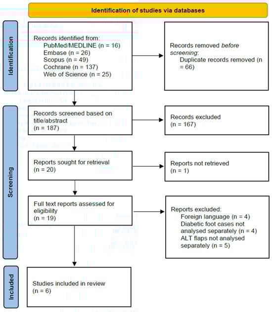 (‘diabetic foot’/exp OR (diabetic foot OR diabetic feet OR foot ulcer* OR diabetic ulcer* OR Charcot foot).ti,ab,kw.) AND (‘free tissue flap’/exp OR (free flap* OR free tissue transfer* OR microsurg*).ti,ab,kw.) AND (anterolateral thigh OR ALT OR ALT flap*).ti,ab,kw. AND (foot OR feet OR pedal OR plantar OR ankle).ti,ab,kw.