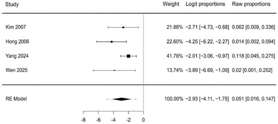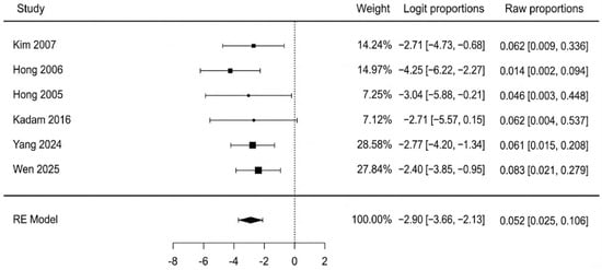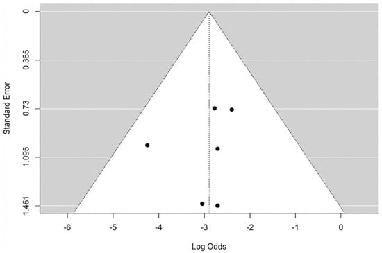 The pooled analysis of all six studies found a total flap failure rate of 5.2% (95% CI: 2.5–10.6%). The analysis showed no evidence of heterogeneity among the studies, with an I2 statistic of 0% (Q = 2.35, p = 0.799), indicating high consistency across the results. A forest plot summarizing the individual study data and the overall pooled estimate is presented in Figure 2. We re-ran the analysis using just the three moderate-quality studies (Hong 2005, Yang 2024, Wen 2025 [,,]) in order to evaluate the robustness of this finding. In this sensitivity analysis, the pooled rate of complete flap failure was 6.7% (95% CI: 2.7–15.7%). This result demonstrates that, even when limited to the best available evidence, the statistical analysis remains reliable. The potential for publication bias for the outcome of complete necrosis was assessed. Visual inspection of the funnel plot revealed a symmetrical distribution of the six included studies (Figure 3). This was supported by Egger’s regression test, which was non-significant (p = 0.647), suggesting no strong evidence of publication bias affecting the pooled estimate.