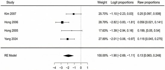 A sensitivity analysis was performed to evaluate the robustness of the pooled estimates of primary outcomes, using a fixed-effect model. Moreover, we excluded studies identified as having a high risk of bias according to the MINORS criteria and recalculated the pooled proportions to assess whether the results differed significantly.
