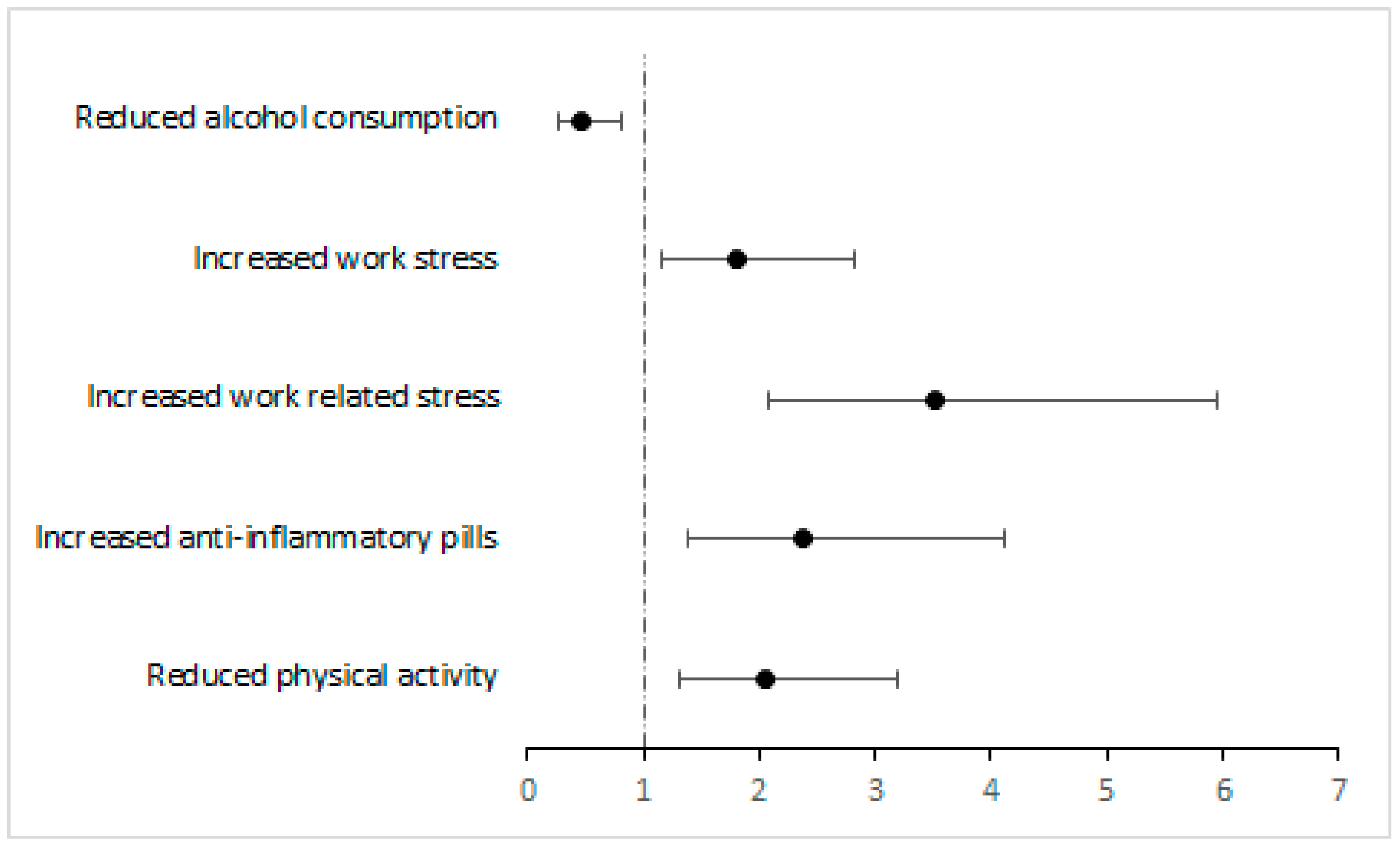 | Increased work-related stress | 1.81 (1.16–2.83) | 0.009 | |