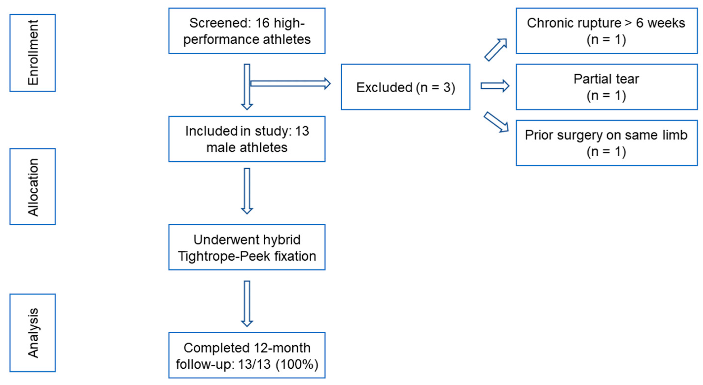 | 6 months | 98 ± 2 | 3 ± 1 | Unrestricted athletic participation | Excellent |