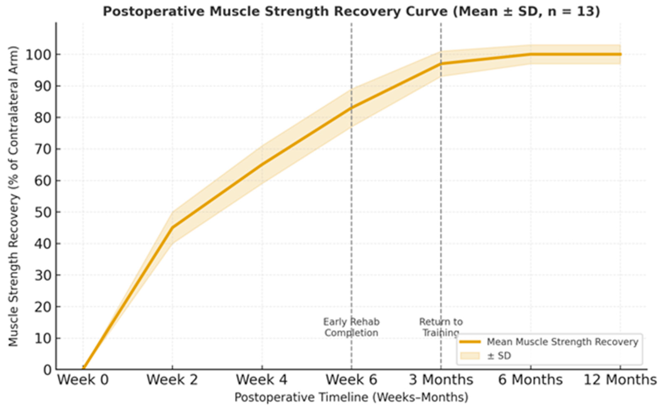 | Muscle strength recovery (% vs. contralateral arm) | 83 ± 6% | 97 ± 4% | 100% | 100% maintained |