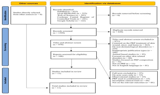 The search of five databases resulted in the identification of 1599 studies. After excluding 620 duplicates, 979 studies were considered for title and abstract evaluation. At this stage, 871 studies were excluded for different reasons, as described in the PRISMA flowchart in Figure 1. Of the 97 full-text studies that remained, 52 were focused on acne scars only, 25 were observational studies, 15 examined PRP in combination with other treatments, 4 were incomplete clinical trials, and 1 did not focus on the relevant outcomes. In the final analysis, 11 articles were selected (Figure 2).