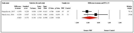 The meta-analysis of two studies comparing PSAS scores between PRP and control groups at the six-month follow-up demonstrated a statistically significant difference favoring PRP. The overall MD was −0.825, with a 95% CI of −1.561 to −0.090 and a significant result (p = 0.028) (Figure 6). The heterogeneity was low to moderate (I2 = 44.8%, p = 0.178), indicating limited variability between the study results. Refer to Supplementary Materials Table S7 for heterogeneity and T2. Funnel plot analysis or Egger’s test could not be conducted, as they require at least three studies.