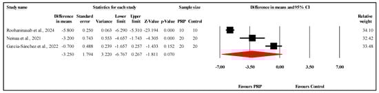The meta-analysis of three studies [,] comparing PSAS scores between PRP and control groups at the three-month follow-up showed no statistically significant difference. The overall MD was −1.157, with a 95% CI ranging from −2.732 to 0.419 and a nonsignificant result (p = 0.150) (Figure 5). The analysis demonstrated very high heterogeneity (I2 = 94.6%, p < 0.001), indicating substantial variability in the results. Egger’s test for publication bias revealed no significant bias, with an intercept of −40.57 (95% CI: −274.82 to 193.69) and a two-tailed p-value of 0.271, suggesting that publication bias is unlikely to have affected the findings. Refer to Supplementary Materials Table S5 for heterogeneity and T2, Figure S3 for the funnel plot and Table S6 for Egger’s test results.
