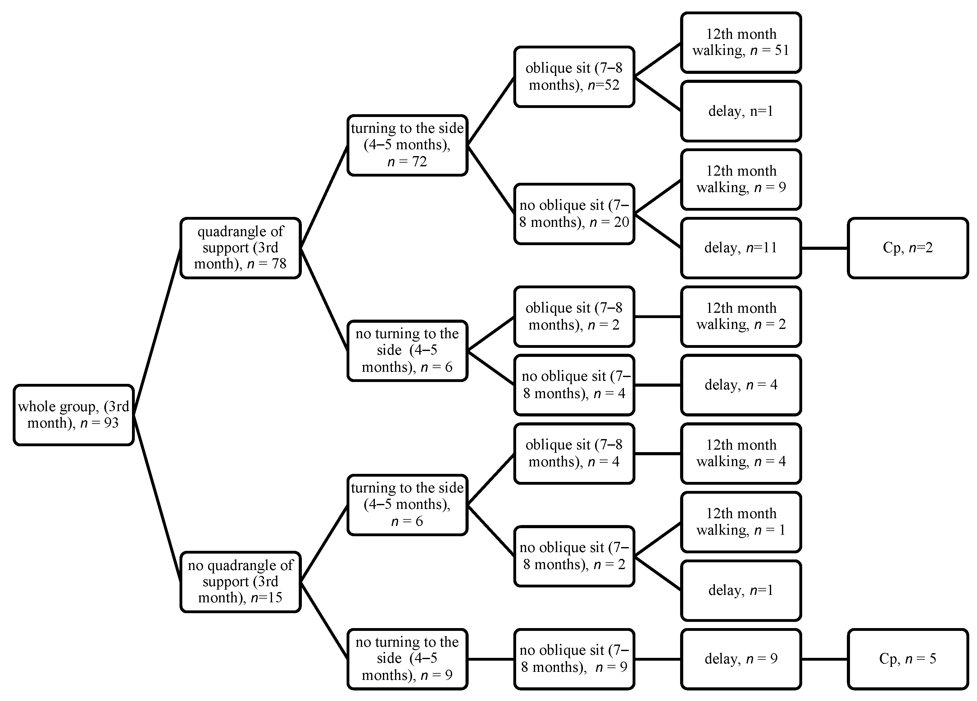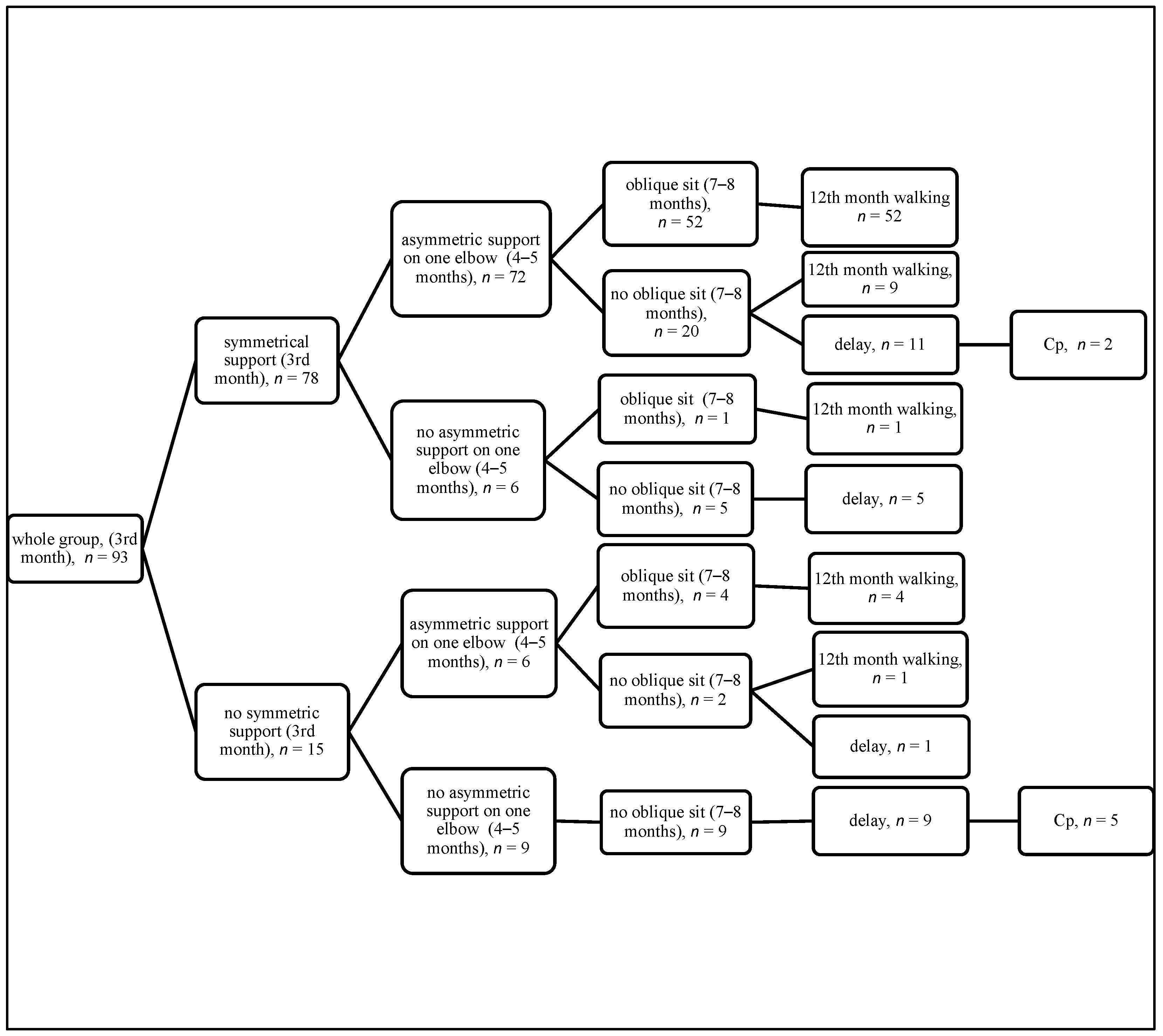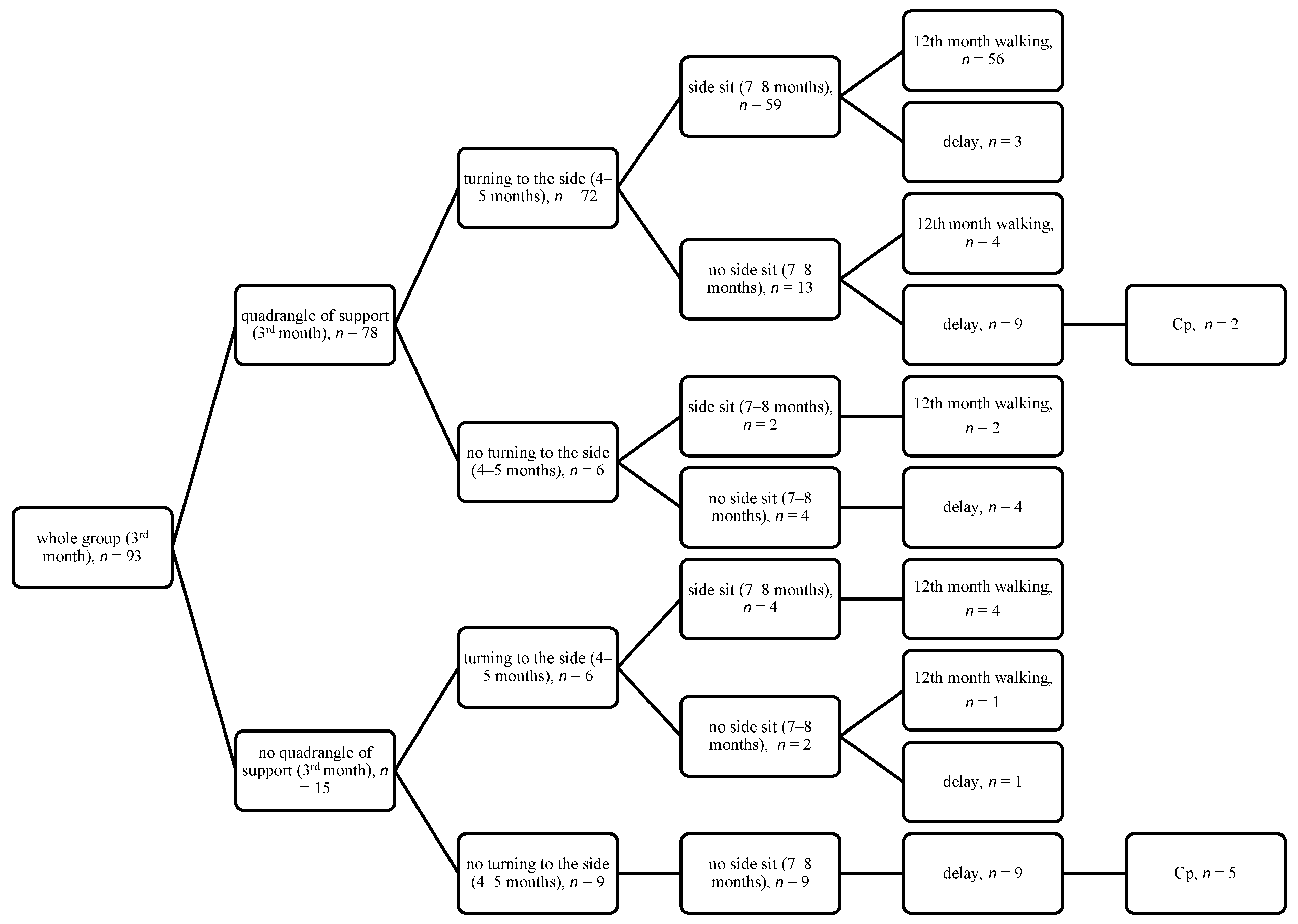 - Gajewska, E.; Sobieska, M.; Moczko, J.; Kuklińska, A.; Laudańska-Krzemińska, I.; Osiński, W. Independent reaching of the sitting position depends on the motor performance in the 3rd month of life. Eur. Rev. Med. Pharmacol. Sci. 2015, 19, 201–208. [Google Scholar] [PubMed]