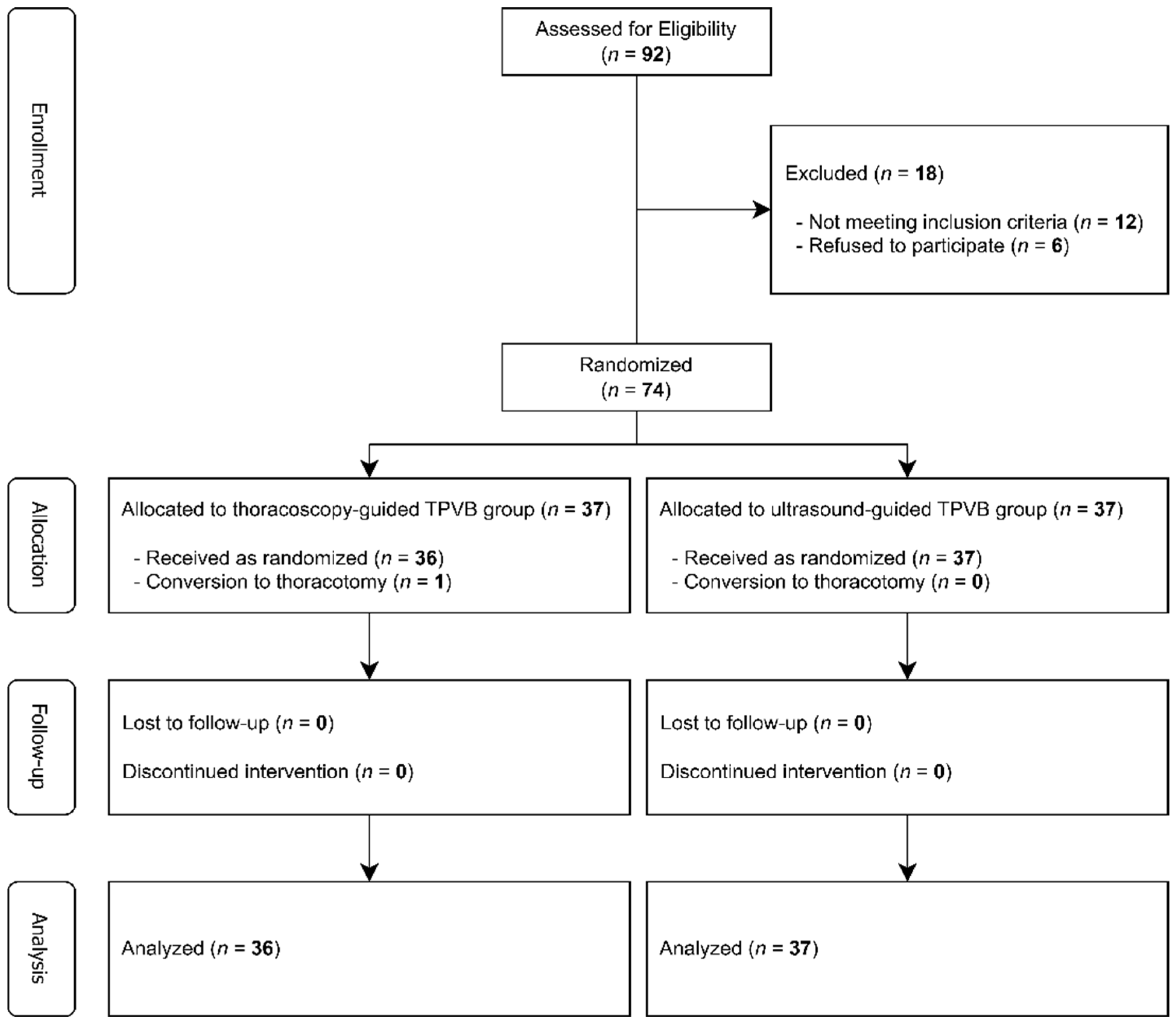 Chicago/Turabian StyleHong, Seok Beom, Kwanyong Hyun, and Hoon Choi. 2025. "Thoracoscopy-Guided vs. Ultrasound-Guided Paravertebral Block in Thoracoscopic Surgery: A Non-Inferiority Randomized Trial" Journal of Clinical Medicine 14, no. 23: 8493. https://doi.org/10.3390/jcm14238493