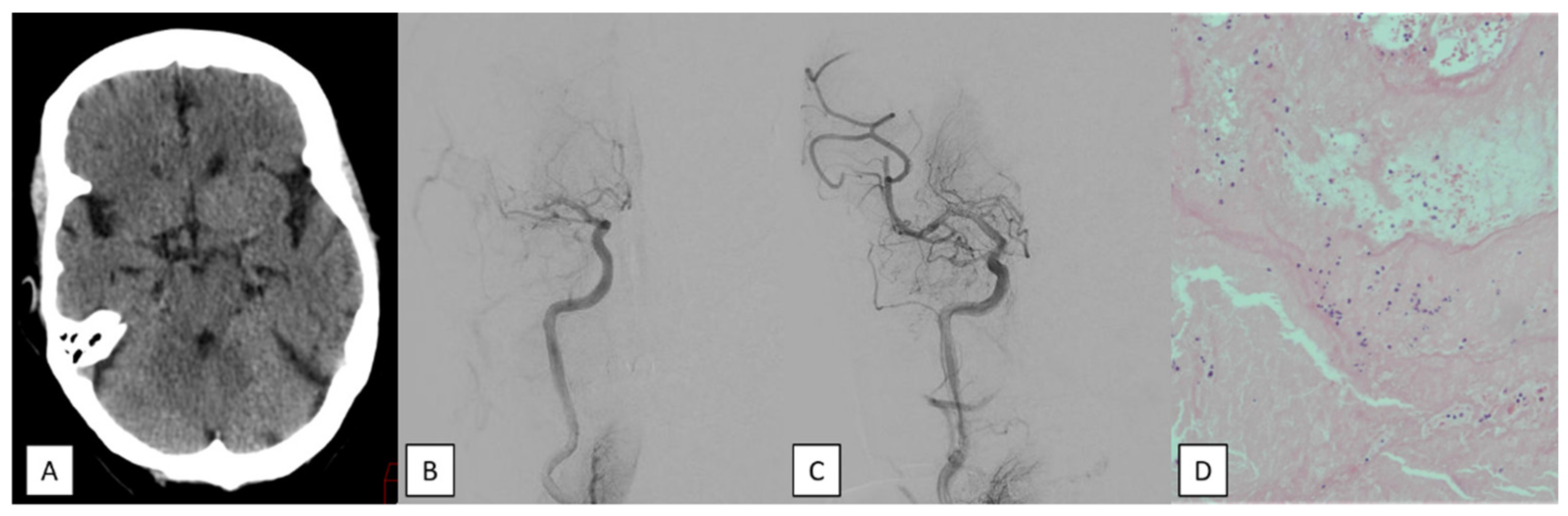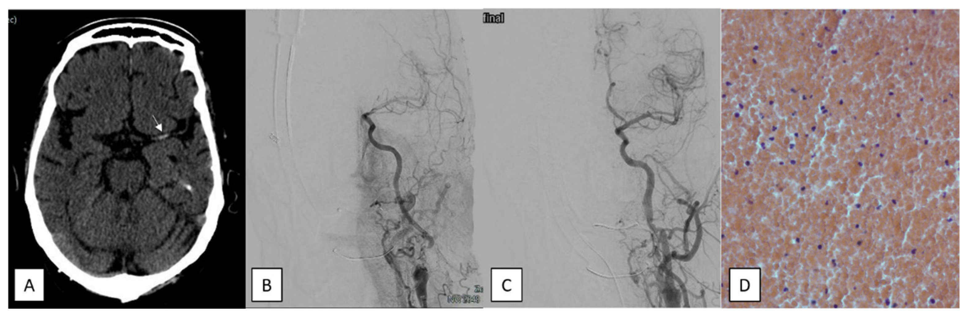 - Hernández-Fernández, F.; Rojas-Bartolomé, L.; García-García, J.; Ayo-Martín, Ó.; Molina-Nuevo, J.D.; Barbella-Aponte, R.A.; Serrano-Heras, G.; Juliá-Molla, E.; Pedrosa-Jiménez, M.J.; Segura, T. Histopathological and Bacteriological Analysis of Thrombus Material Extracted During Mechanical Thrombectomy in Acute Stroke Patients. Cardiovasc. Intervent Radiol. 2017, 40, 1851–1860. [Google Scholar] [CrossRef]