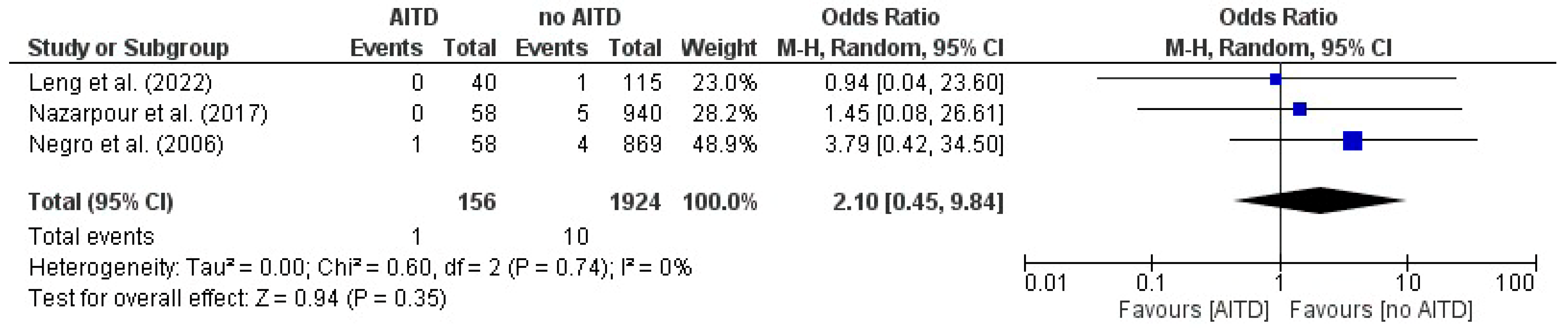 3.10. Placental Abruption: AITD Patients vs. Non-AITD Patients