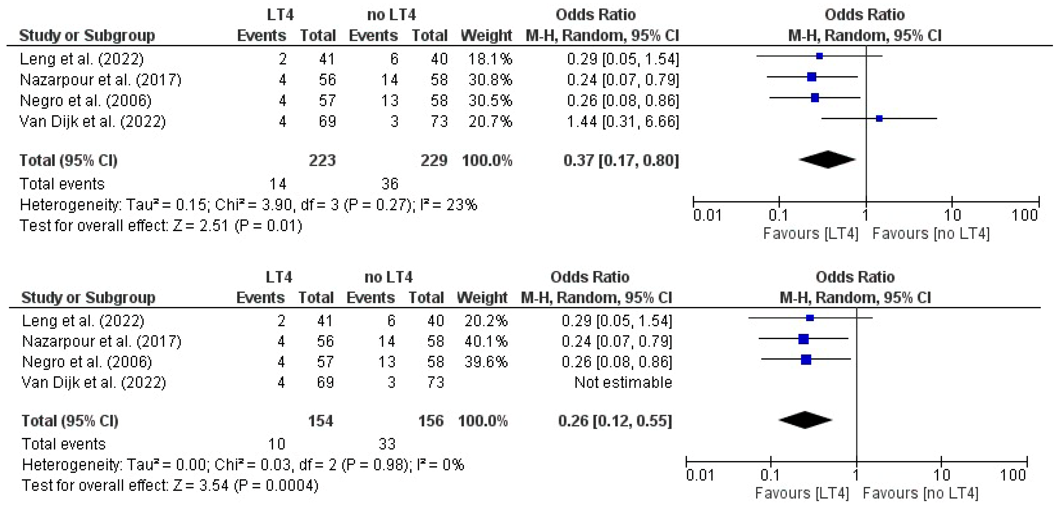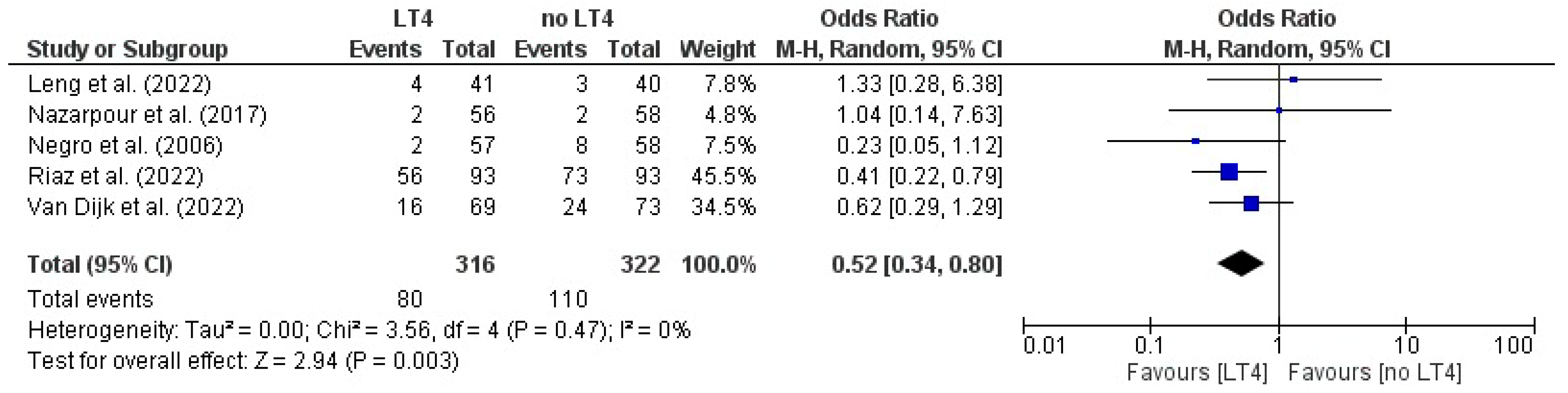 | Leng et al. (2022) [23] | PRL group RPL + SCH: LT4 = 28 (21.4) Control = 54 (39.7) RPL + TPOAb+: LT4 = 3 (7.1) Control = 11 (26.8) Normal group Normal + SCH LT4 = 24 (21.4) Control = 22 (19.1) Normal + TPOAb+ LT4 = 4 (9.7) Control = 3 (5.7) | NR | PRL group RPL + SCH: LT4 = 11 (11.9) Control = 22 (35.3) RPL + TPOAb+: LT4 = 3 (7.9) Control = 3 (10.7) Normal group Normal + SCH LT4 = 2 (2.6) Control = 7 (9.9) Normal + TPOAb+ LT4 = 2 (5.9) Control = 6 (17.1) | PRL group RPL + SCH: LT4 = 92 (70.2) Control = 64 (47.1) RPL + TPOAb+: LT4 = 38 (90.5) Control = 28 (68.3) Normal group Normal + SCH LT4 = 7 (69.6) Control = 71 (61.7) Normal + TPOAb+ LT4 = 34 (82.9) Control = 35 (87.5) | PRL group RPL + SCH: LT4 = 11 (8.4) Control = 18 (13.2) RPL + TPOAb+: LT4 = 1 (2.4) Control = 2 (4.9) Normal group Normal + SCH LT4 = 10 (8.9) Control = 22 (19.1) Normal + TPOAb+ LT4 = 3 (7.3) Control = 2 (5) |
