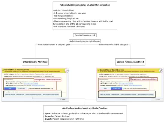- Nguyen, K.; Wilson, D.L.; Diiulio, J.; Hall, B.; Militello, L.; Gellad, W.F.; Harle, C.A.; Lewis, M.; Schmidt, S.; Rosenberg, E.I.; et al. Design and development of a machine-learning-driven opioid overdose risk prediction tool integrated in electronic health records in primary care settings. Bioelectron. Med. 2024, 10, 24. [Google Scholar] [CrossRef]