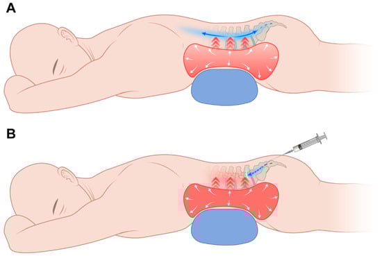 Schematic illustration showing the placement of a pillow under the abdomen and its effect on caudal block. (A) Injection before increasing intra-abdominal pressure by pillow. Injectate may spread widely. (B) Injection after increasing intra-abdominal pressure by pillow. Impeded cephalic spread of injectate.