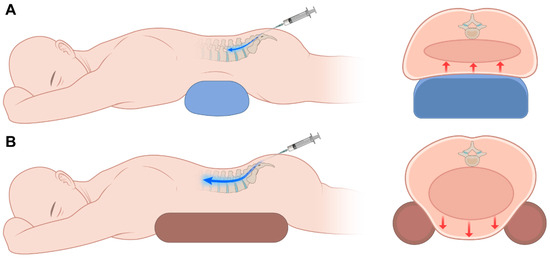 However, despite its apparent safety, caudal epidural injection has a significant limitation. Its injectate often fails to reach the desired lumbar level due to the long distance from the sacral hiatus and the loss of volume caused by leakage into the sacral foramina [6,7]. Moreover, lumbar pathology can result in resistance to injectate spread in the epidural space [8]. Epidural fibrosis and adhesions are considered to interrupt nerve root blood supply, which can prevent contact of the injectate with the affected nerve root [9]. In addition, after injection of spinal or epidural block, increased abdominal pressure after spinal or epidural injection may promote broad injectate distribution. However, placing a conventional pillow under the abdomen increases intra-abdominal pressure, which can impede cephalad injectate spread during caudal injection (Figure 1).