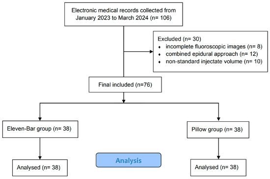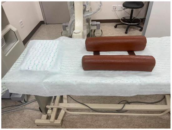 Seventy-six patients were enrolled in the study. The patient selection process is summarized in the STROBE flow diagram (Figure 3). Patients were divided into two groups. Thirty-eight patients underwent the procedure using the eleven-bar cushion (eleven-bar, Wellness Korea, Chuncheon, Republic of Korea) for pelvic support (eleven-bar group), and 38 patients underwent the procedure with conventional pillow support (pillow group). Assignment to the eleven-bar group or pillow group was determined by the availability of the cushion in each procedure room, rather than by clinical characteristics or operator preference. Therefore, the allocation was non-random. Each eleven-bar cushion measures 10 cm in height, 10 cm in width, and 50 cm in length, and is composed of two separate pieces (Figure 4). In addition, it is composed of high-density polyurethane foam with a density of approximately 32–50 kg/m3 and Shore A 25–45 range of hardness. Place and use at appropriate intervals between two bars according to the patient’s pelvic size. We reviewed fluoroscopic images of the procedure and analyzed the VAS score, which was checked before and one month after the procedure.